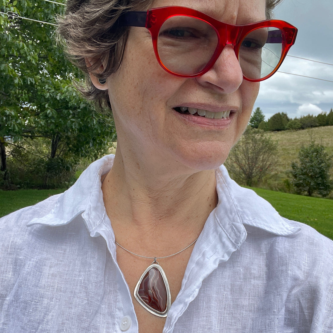 A photo of a white woman with short hair, red glasses and a handmade pendant on a white shirt.