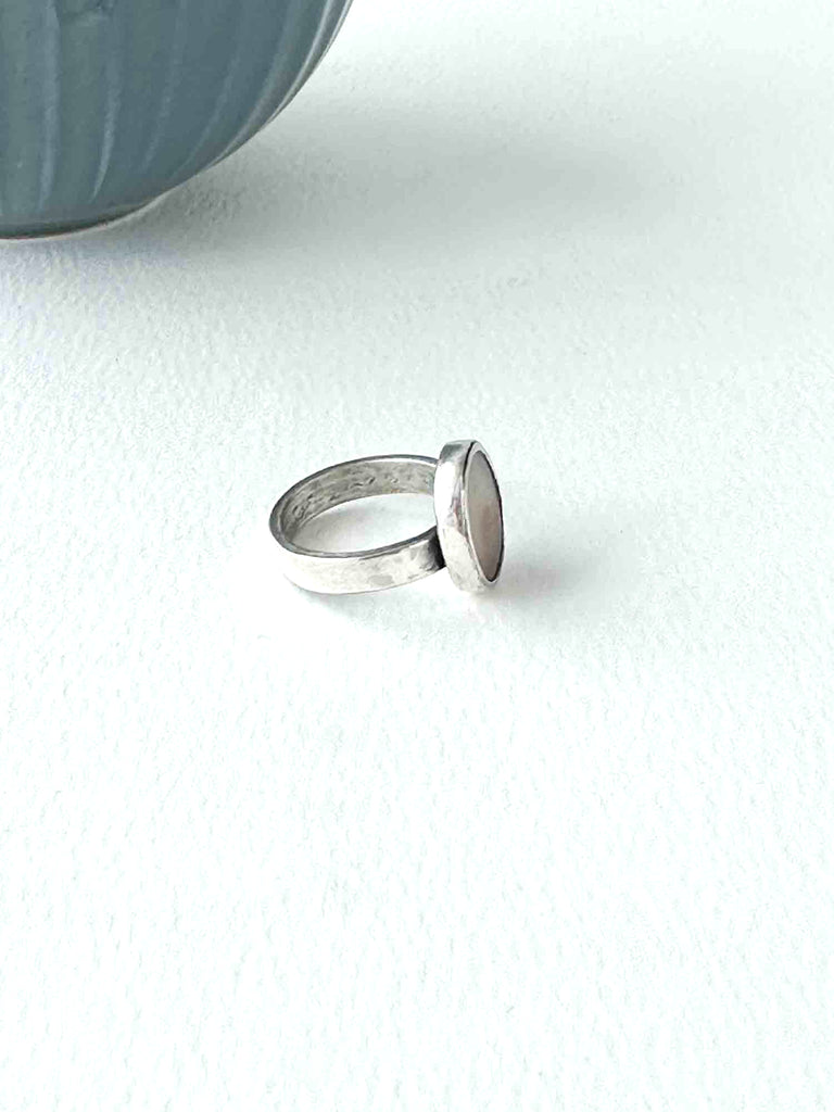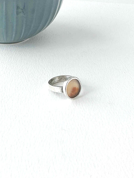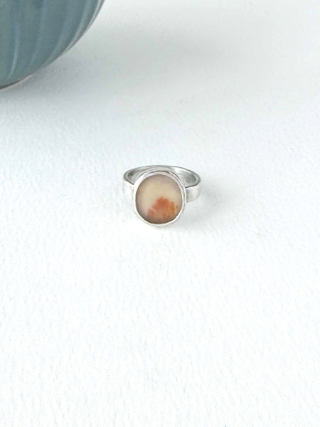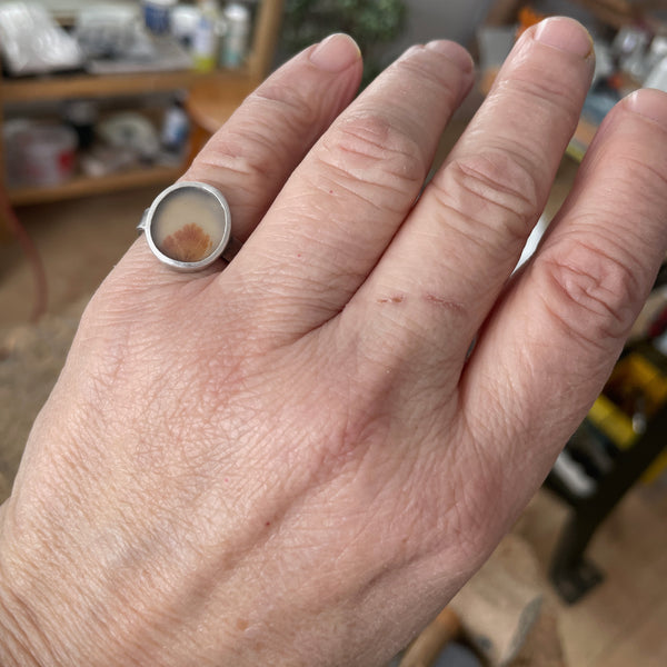 A beautiful oval dendritic agate with lovely orange dendrites on a milky agate background. The stone has a flat surface. It's a great ring to wear every day and forever. It's the ring for you if you're looking for a one-of-a-kind piece. It would also make a very unique gift!