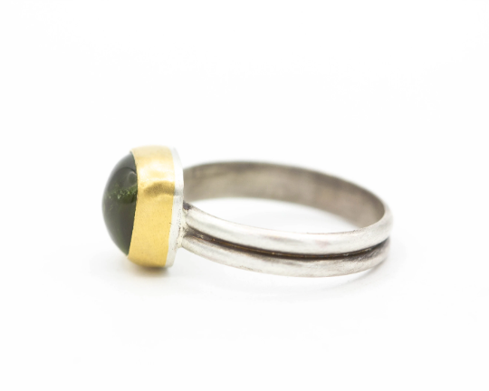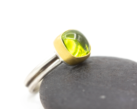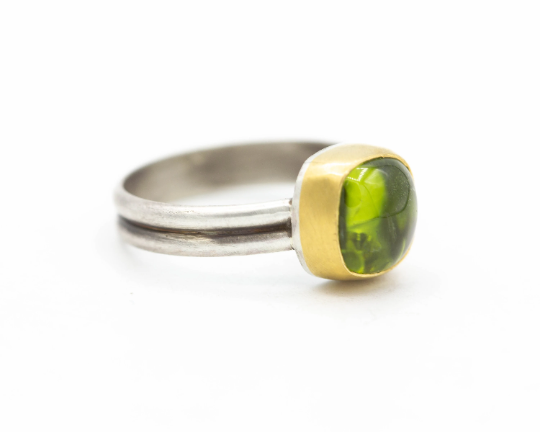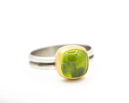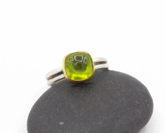 This is a lovely fresh-green peridot that is square with rounded corners. Peridot is August's birthstone. It's set in 22k gold and sterling on a double half-round sterling band. It's perfect for spring and would be a unique addition to your jewelry collection!