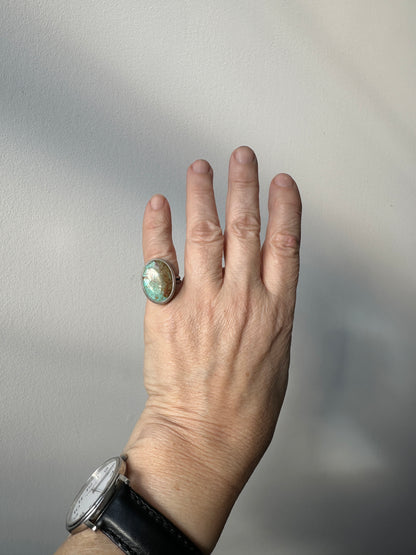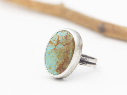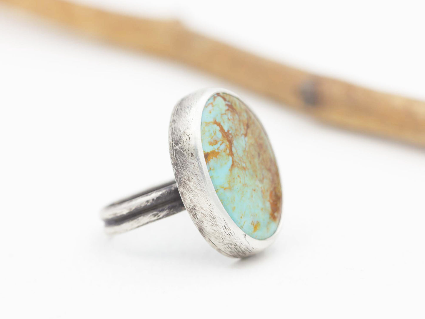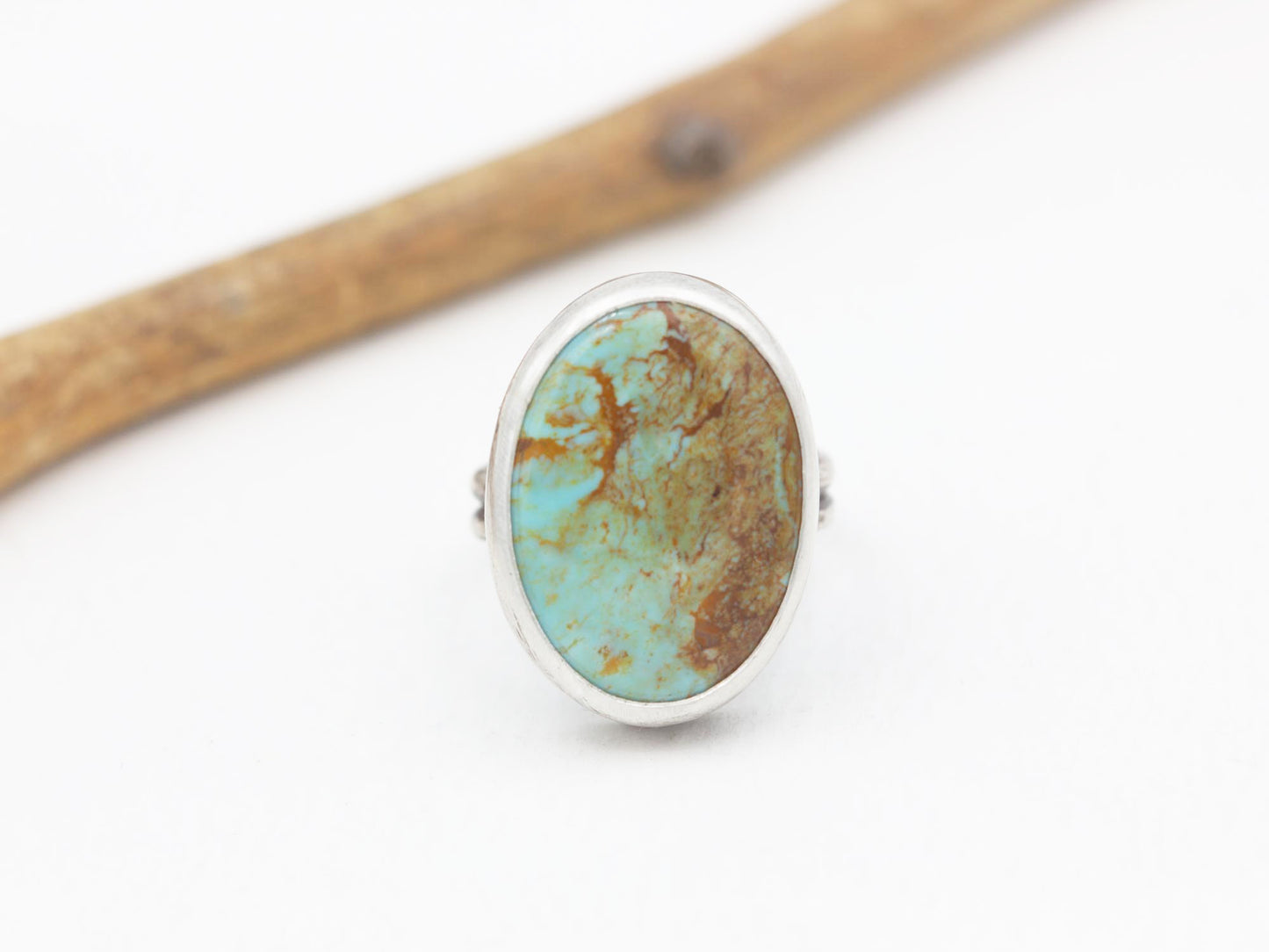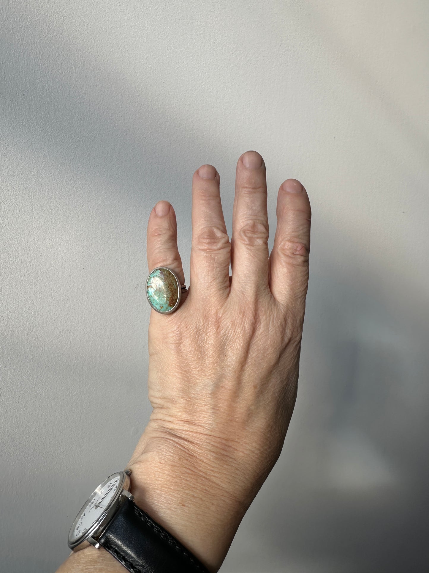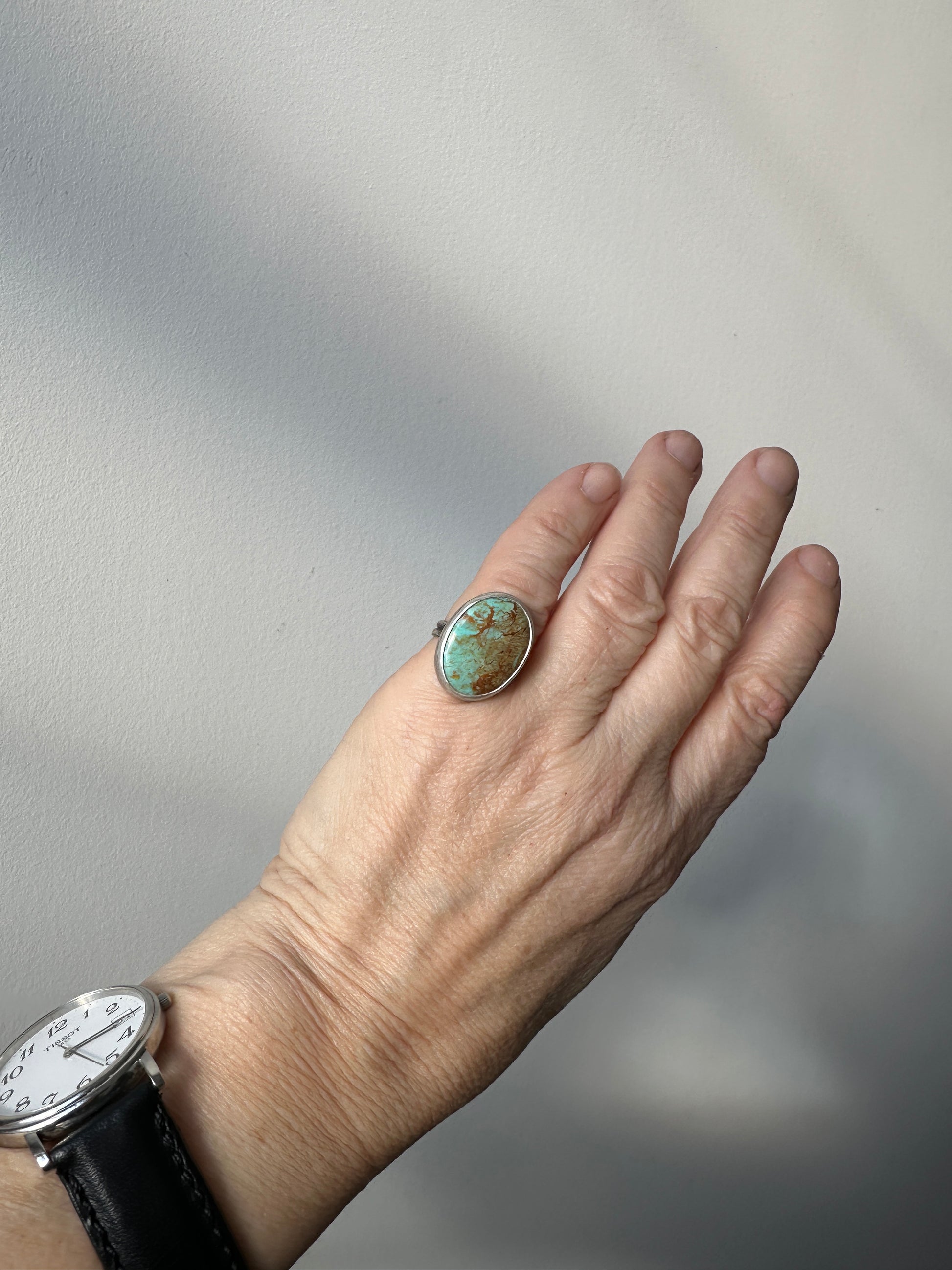 This gorgeous oval turquoise is a beautiful mix of turquoise and the brown matrix. It has a fine silver and sterling bezel setting, with a double half-round sterling shank. It's got a great boho feel. Put this on, and you'll never want to take it off!