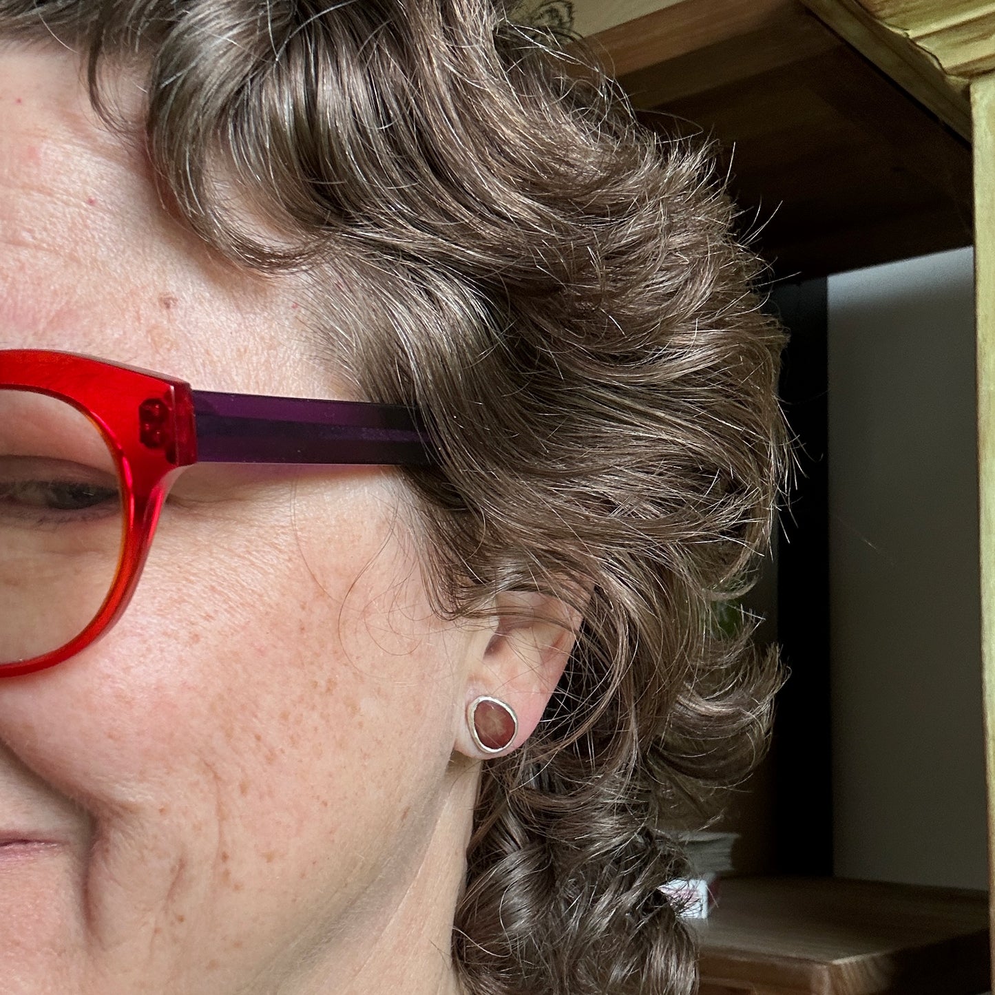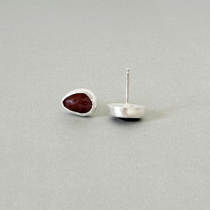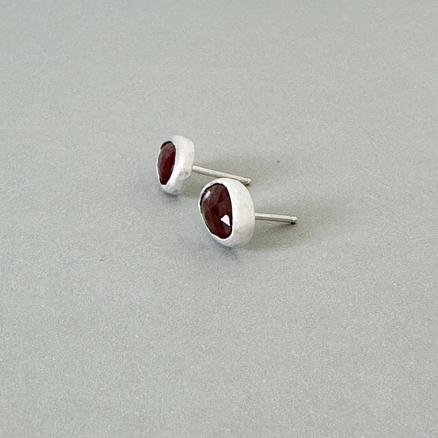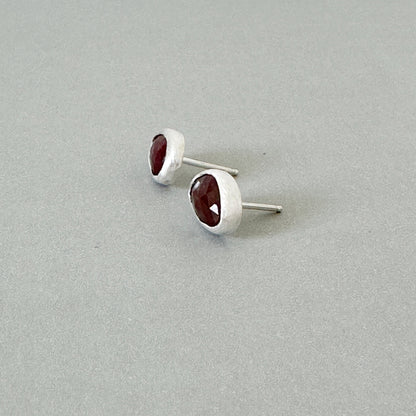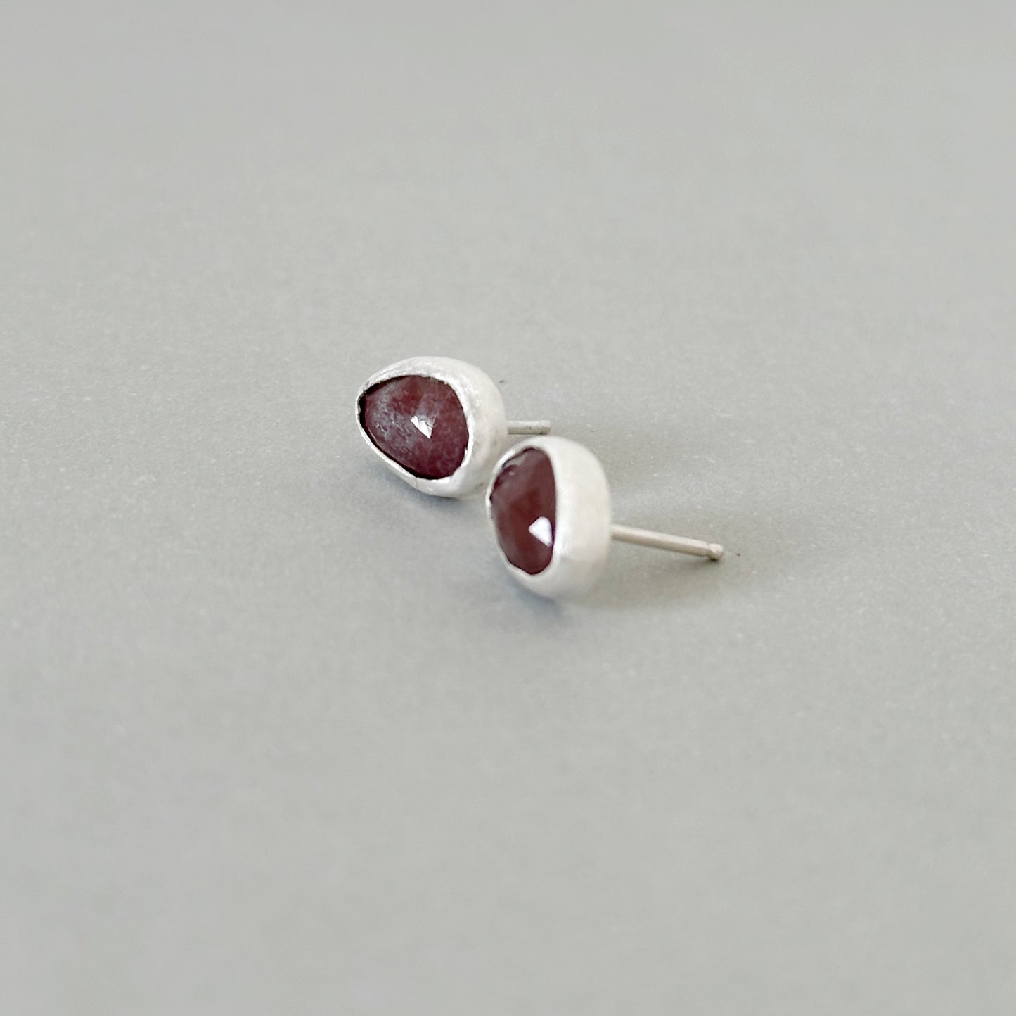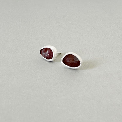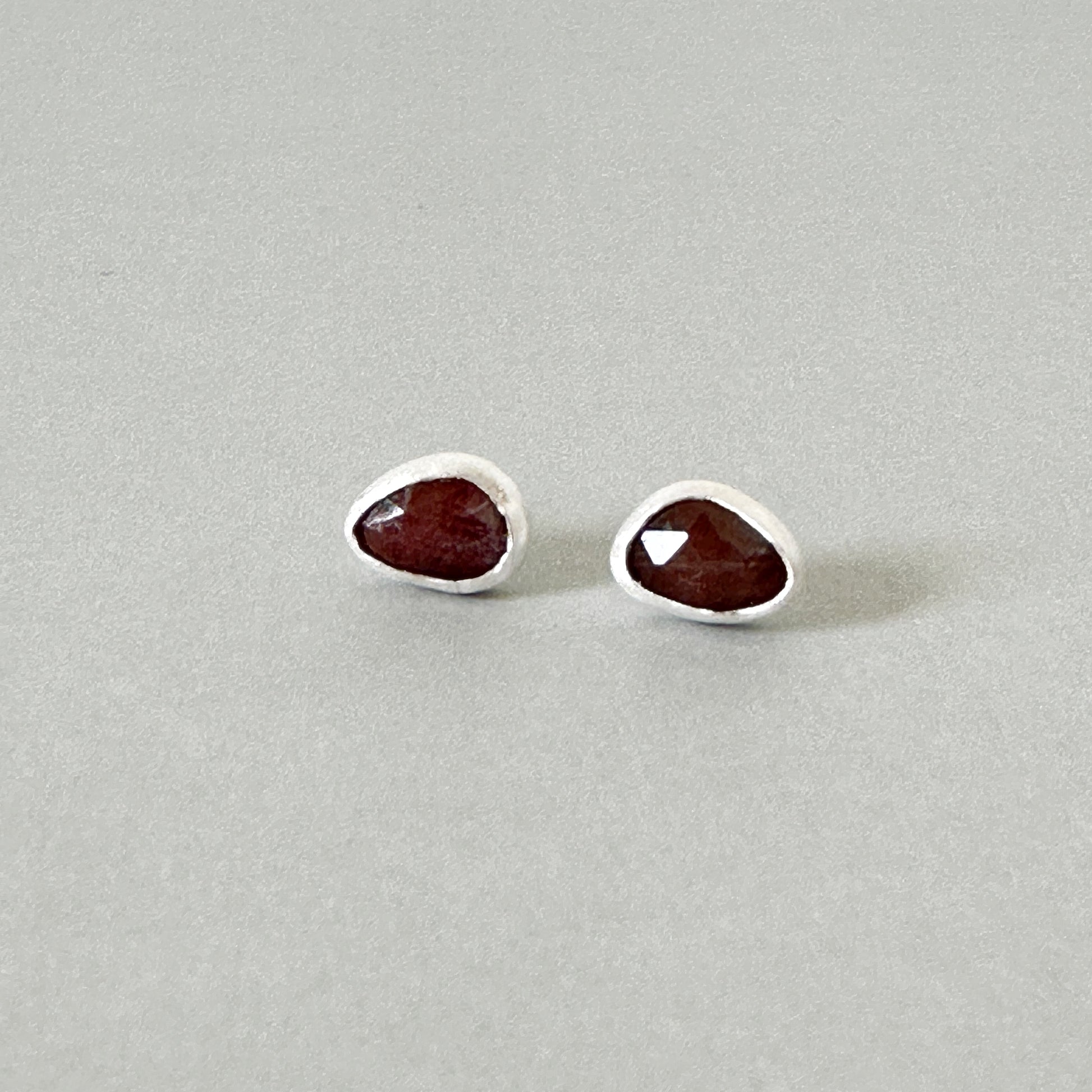 These are the prettiest, rose-cut Andesine stones set into asymmetric sterling silver post earrings. They are a gorgeous red with a hint of green and lots of shimmer and shine. I think we all need a pair like this for when you want to be seen and feel great! Who can resist? They're set in sterling and fine silver, with a sterling post. They come with sterling clutches or rubber, whichever you prefer.
