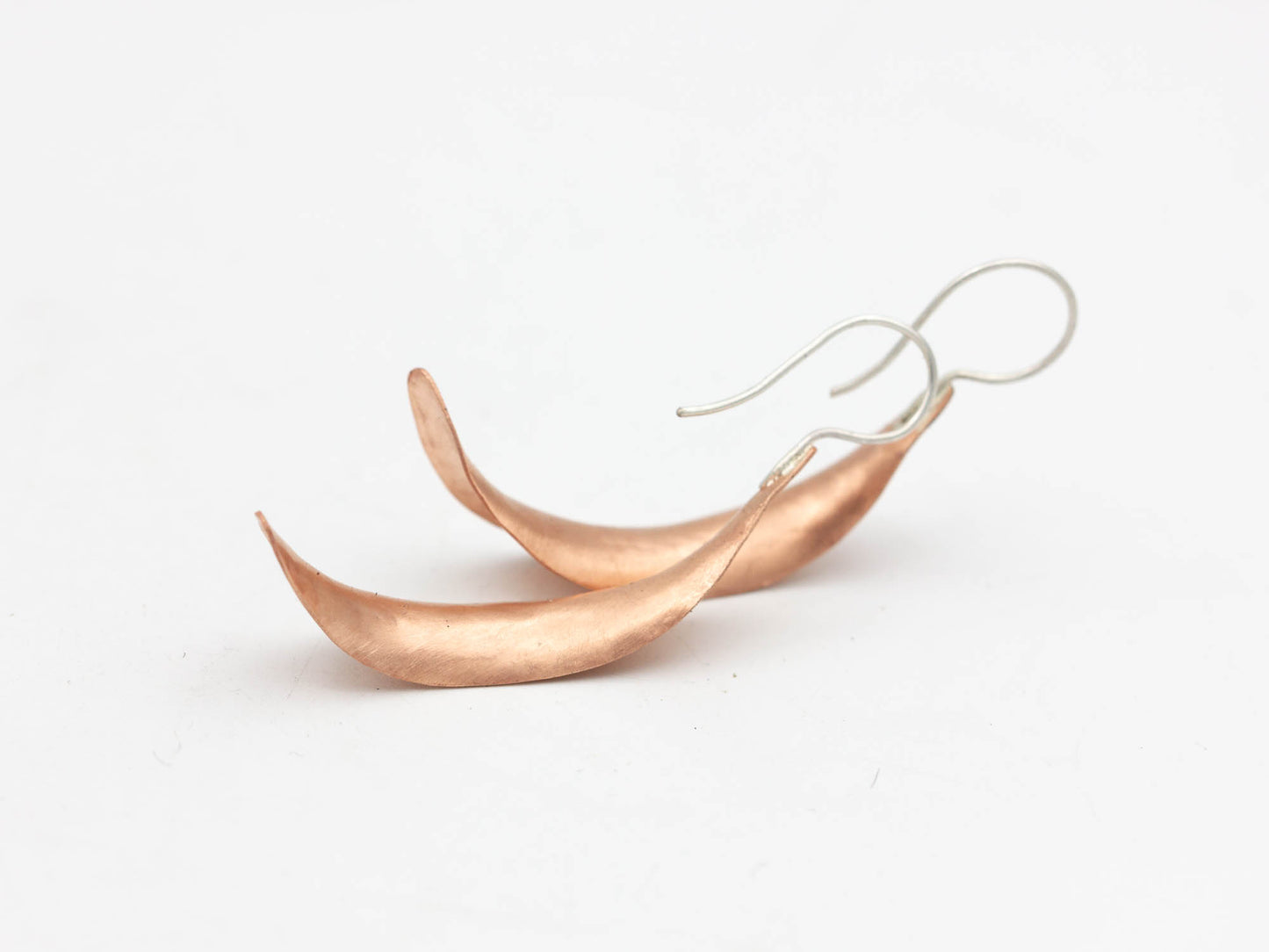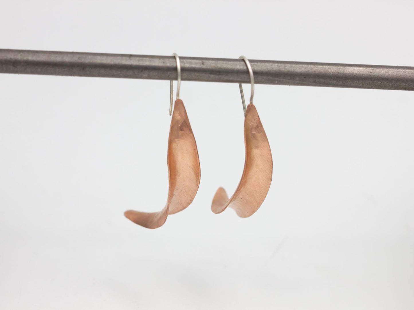 Aren't these earrings the best?! I formed them with various hammers from a tapered strip of copper. I anticlast them, then gently torque them to end up with this elegant shape. They hang from sterling silver ear wires and have lots of glimmery movement! They're a wonderful, unique pair of statement earrings.
