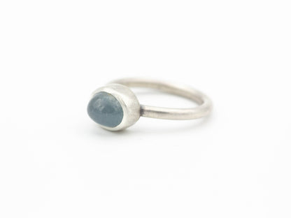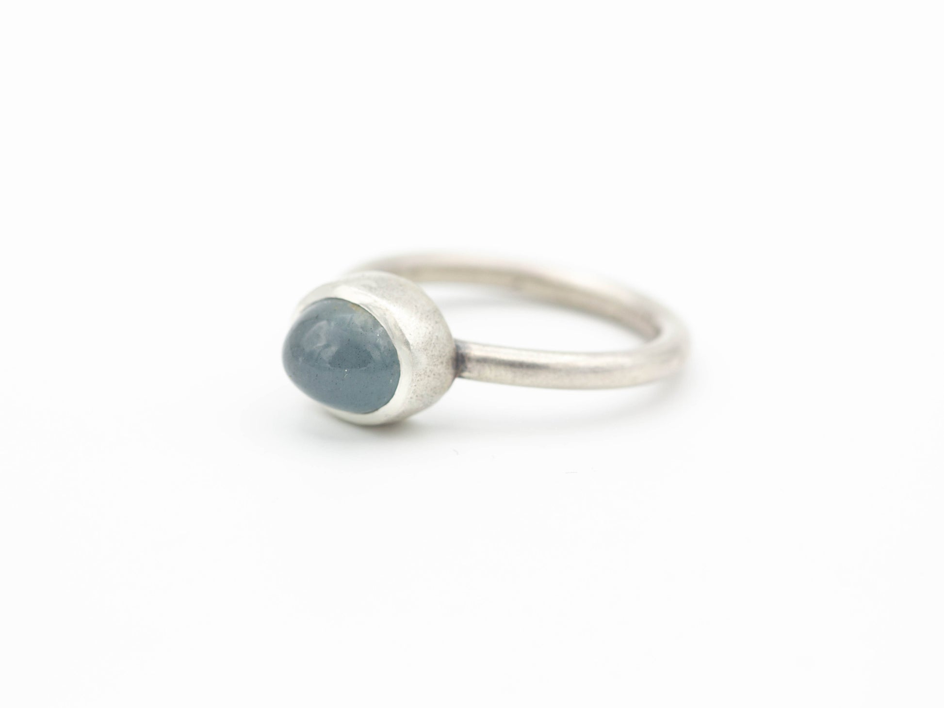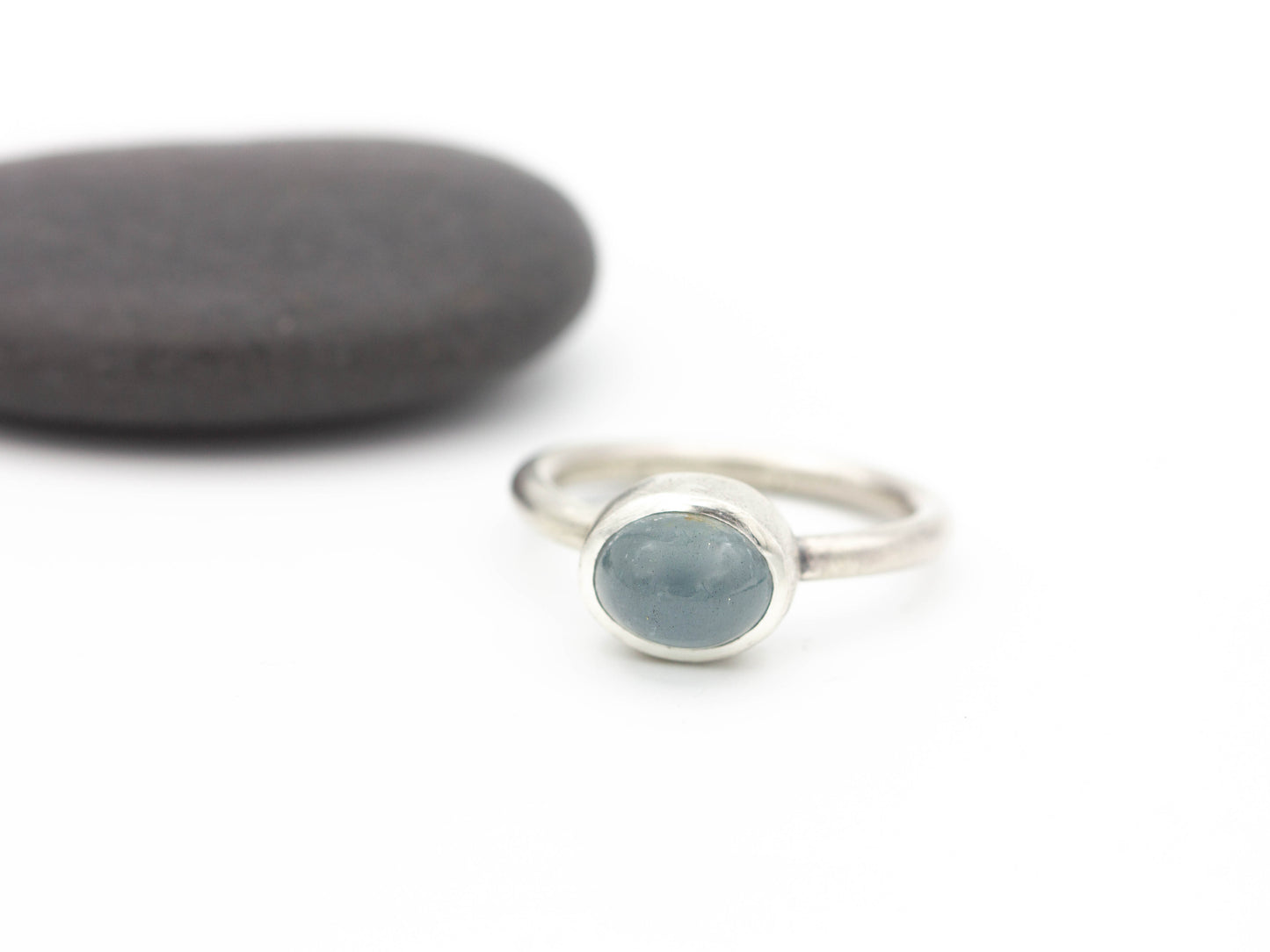This is a high domed, lovely oval moss aquamarine cabochon. I've featured it in a minimalist, sterling silver ring with a simple, round sterling shank. It's wonderful and comfy to wear and would be perfect for everyday. The "moss" in moss aquamarine comes from iron trace elements that give the stone a moss-like appearance. They're often a greenish-blue with mossy features in a transparent gem body. This one is more of a pale blue.