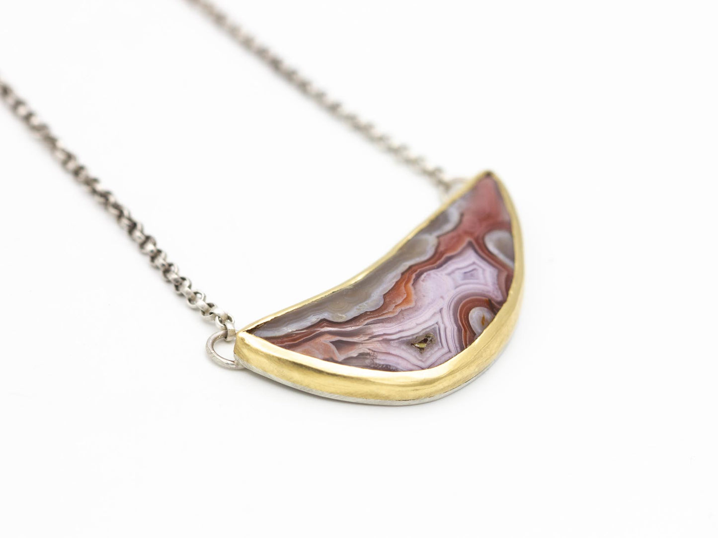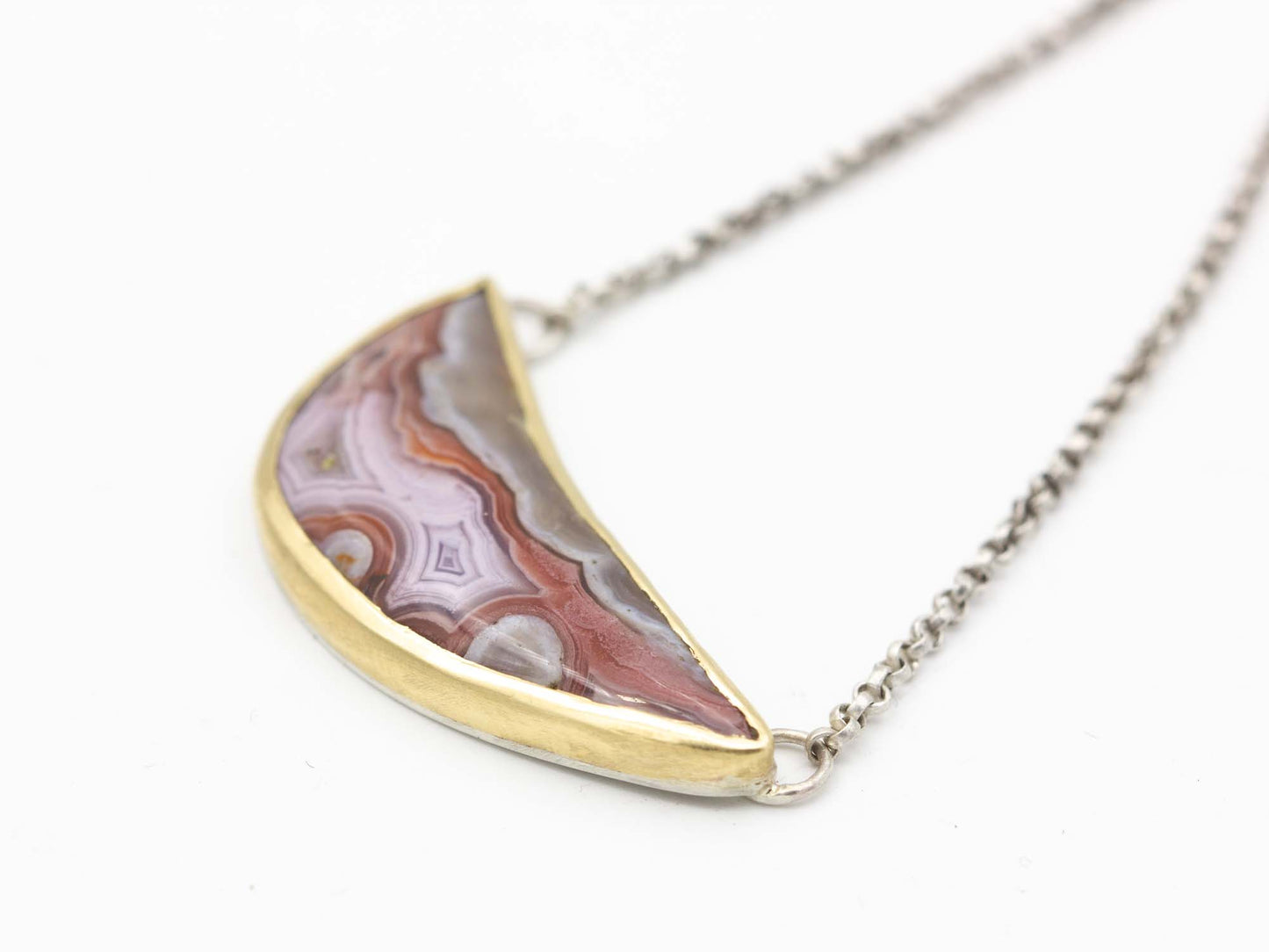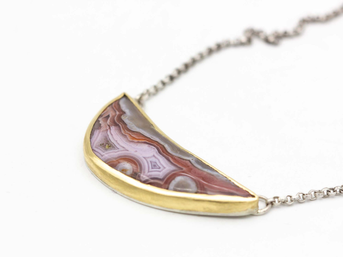 This crescent-shaped Crazy Lace Agate is so gorgeous! I used it in a statement pendant, with golden brass bezel setting on sterling silver, with a cutout back. It has a sterling rolo chain. The chain closes securely with a sterling hook. It's will ensure you are seen as the strong, confidant and unique woman you are!