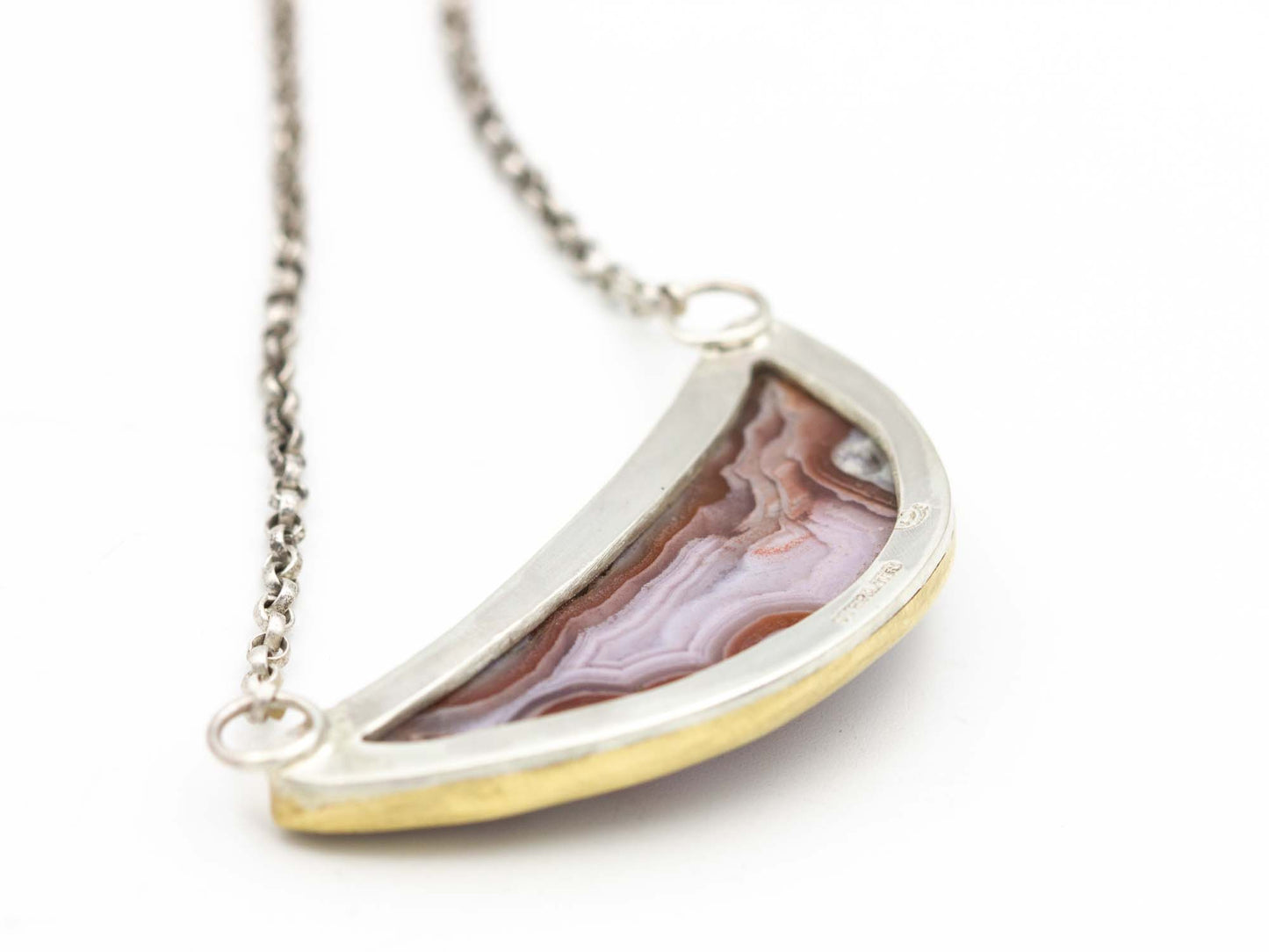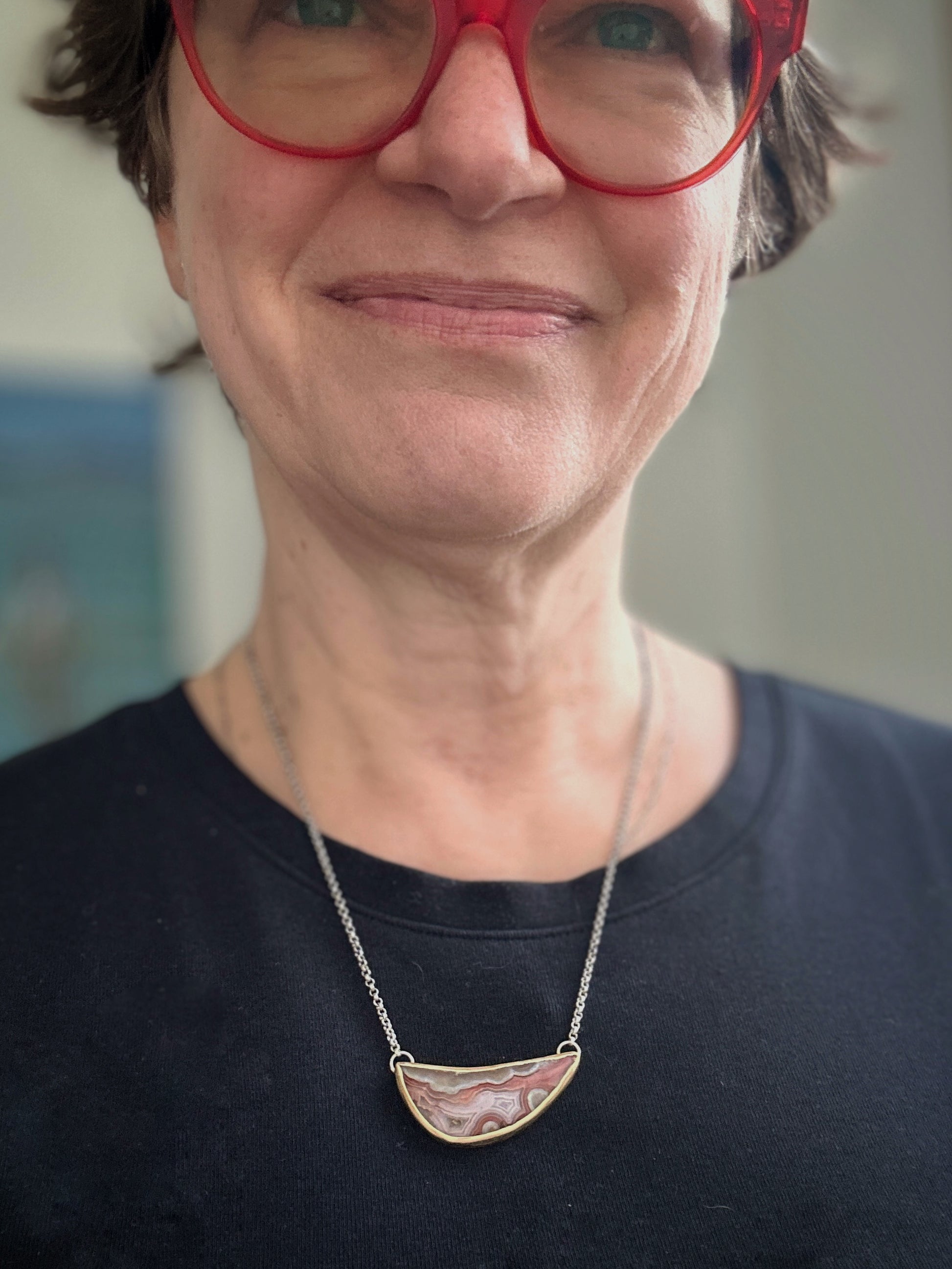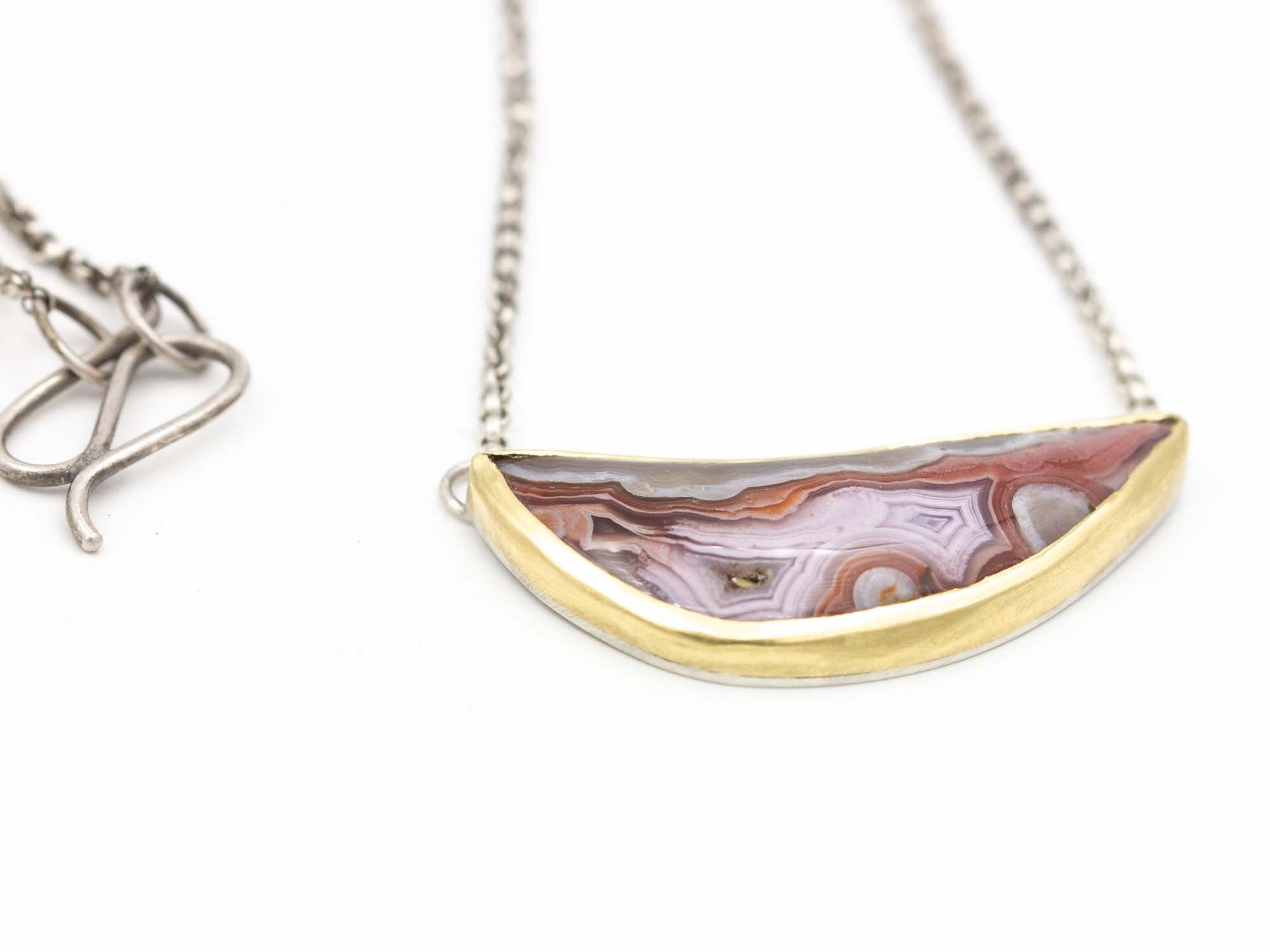 This crescent-shaped Crazy Lace Agate is so gorgeous! I used it in a statement pendant, with golden brass bezel setting on sterling silver, with a cutout back. It has a sterling rolo chain. The chain closes securely with a sterling hook. It's will ensure you are seen as the strong, confidant and unique woman you are!