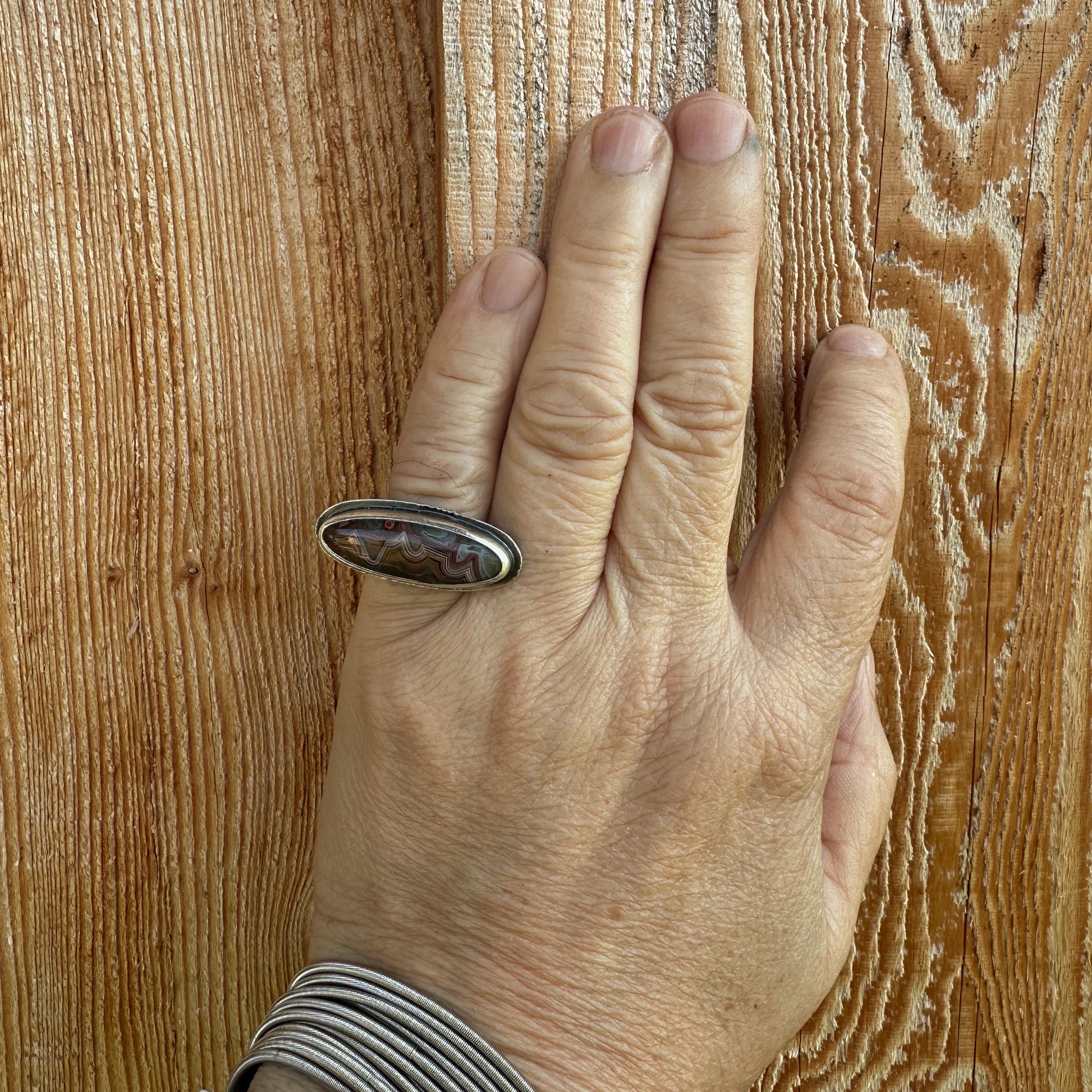 I set it in an east-west orientation rather than the more common north-south. It has a fine silver and sterling bezel setting, with a slight hammered texture around the edge of the setting. It has a hammered, rustic sterling band.