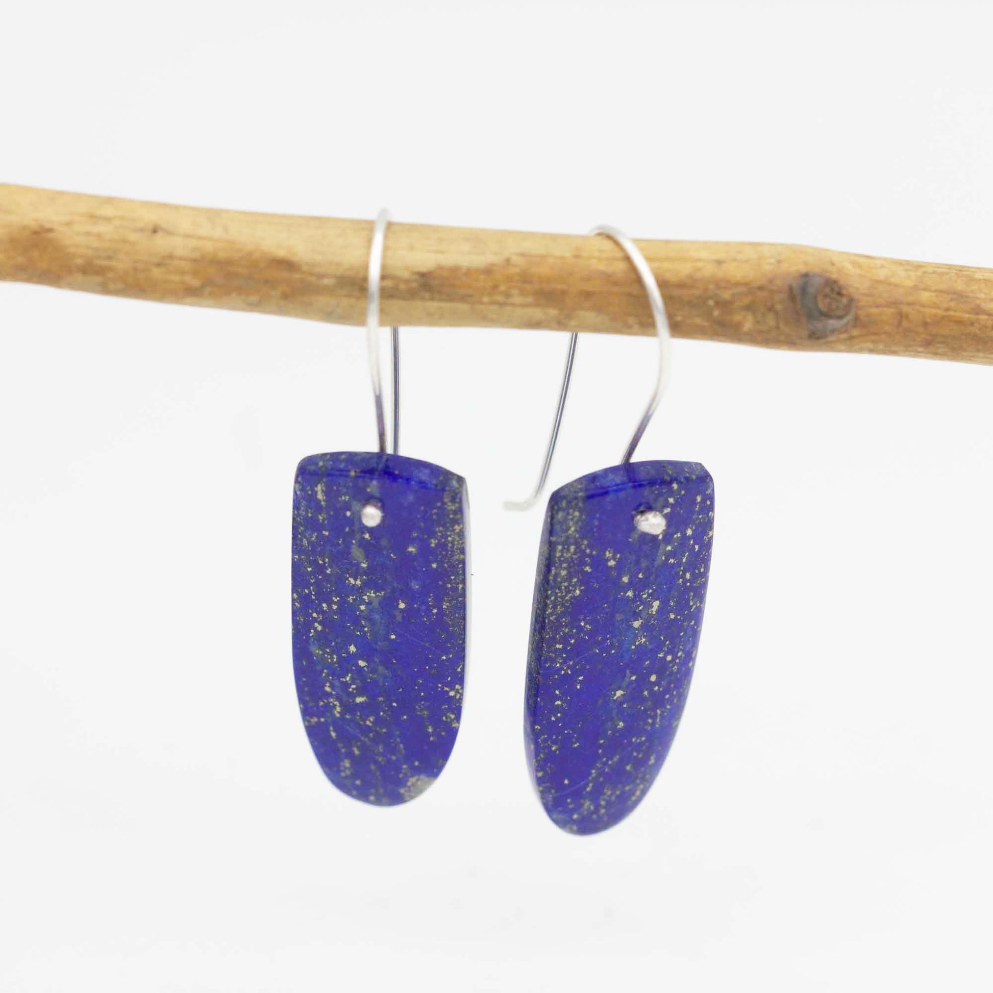 Embrace your authentic style with these beautiful lapis lazuli drop earrings. The rich royal blue stones paired with sterling silver ear wires create a look that's both grounded and expressive. These gorgeous stones have pinpoints of shimmery, golden pyrite throughout. Whether you're building confidence in your personal aesthetic or honoring a long-standing love of statement jewelry, these earrings support your journey. They're a reminder that choosing pieces you truly connect with is always the right choice.