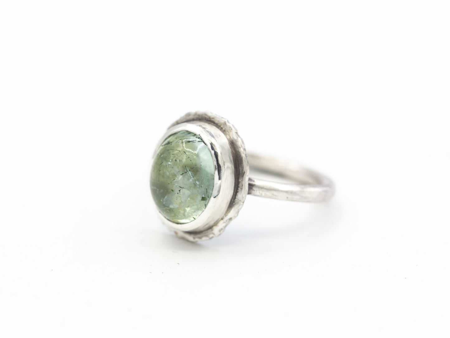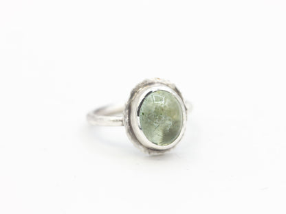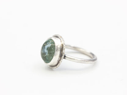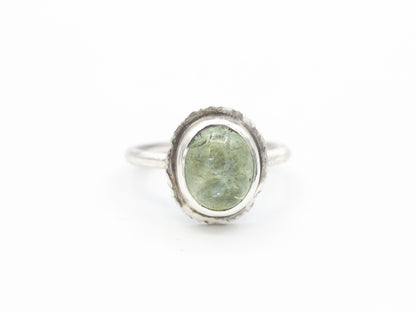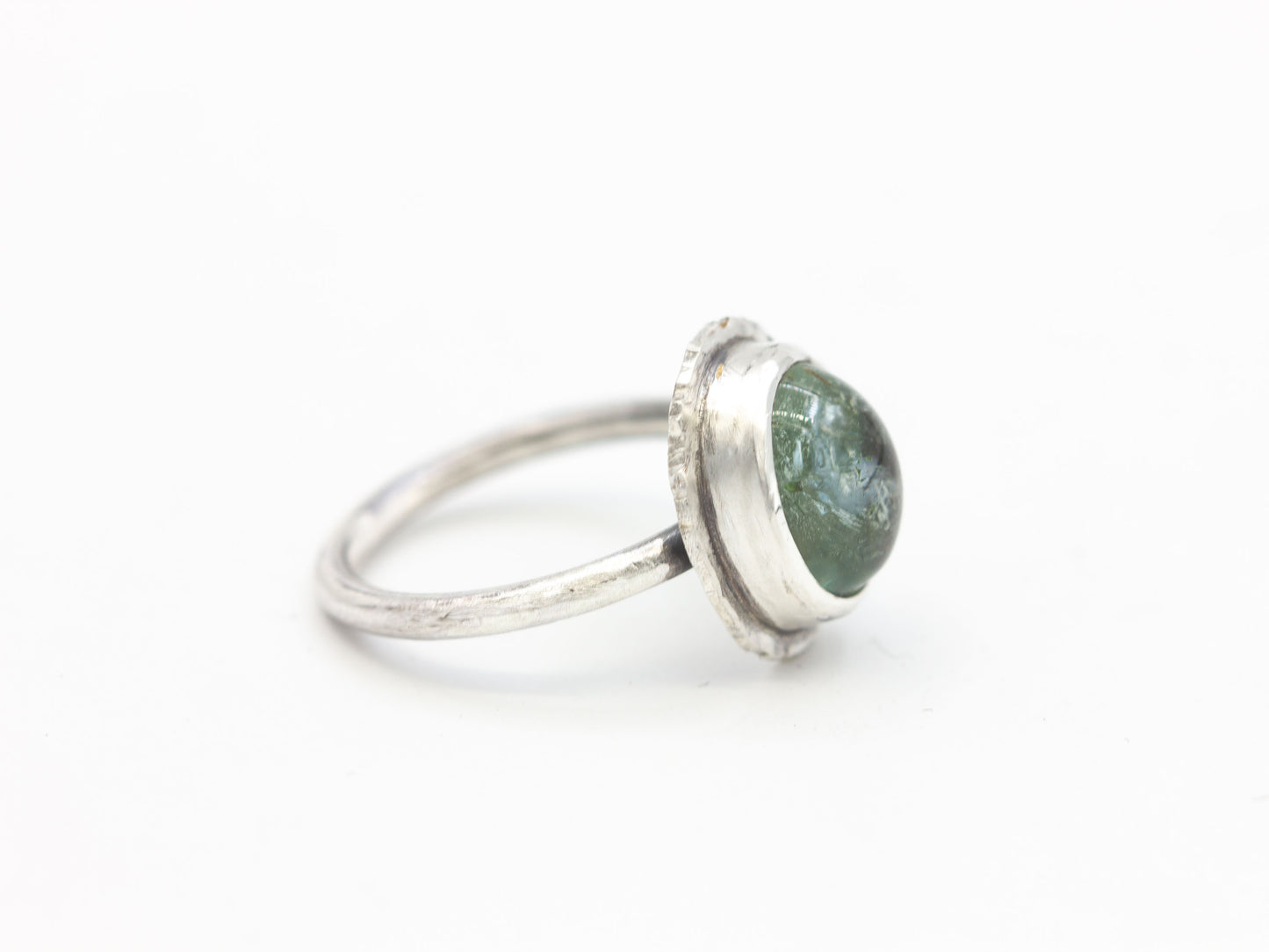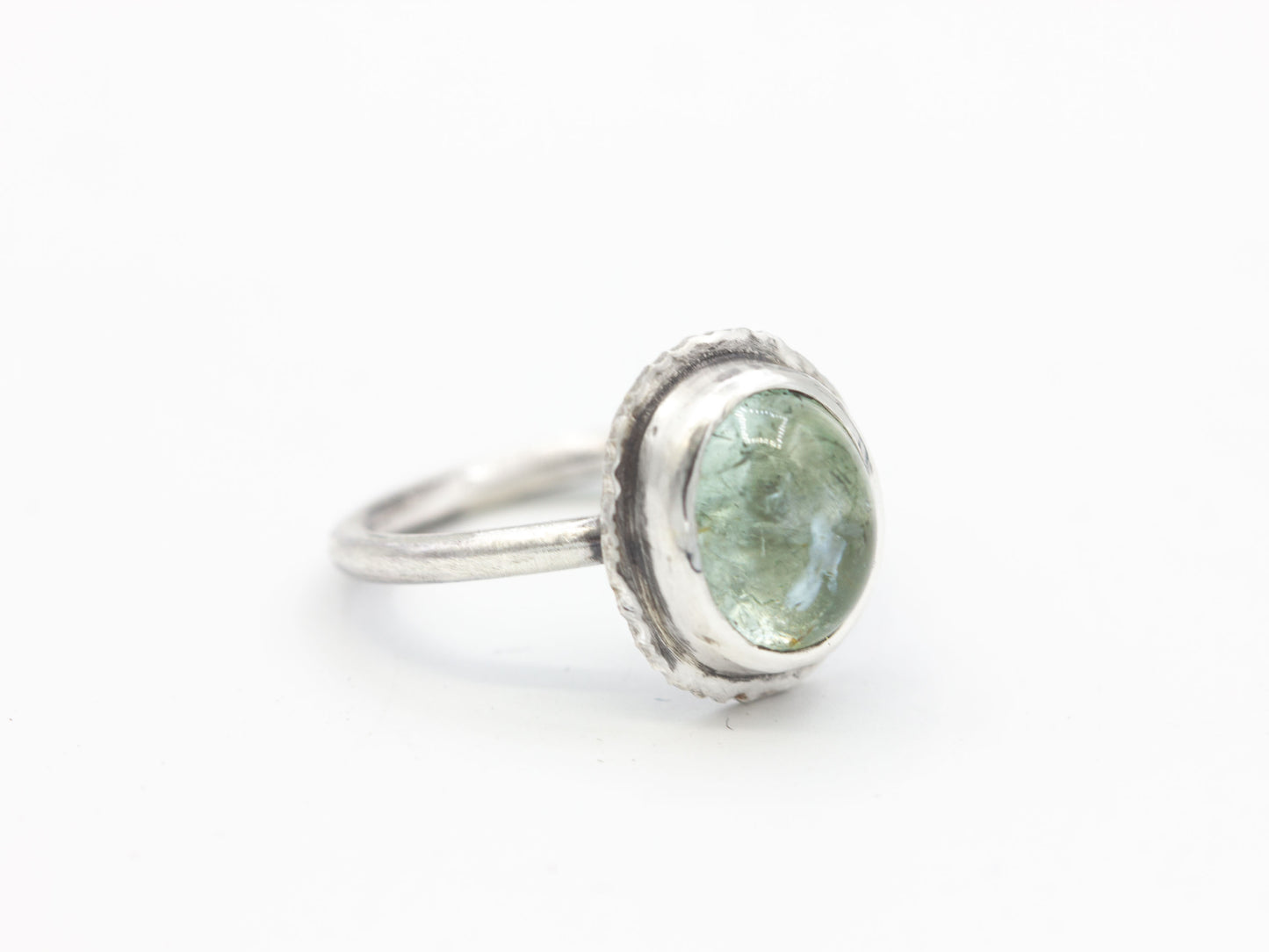 This is a lovely oval moss aquamarine cabochon. It's featured in a sterling silver statement ring with a delicate, round sterling shank. It's wonderful to wear and would be perfect for everyday. The "moss" in moss aquamarine comes from iron trace elements that give the stone a moss-like appearance. They're often a greenish-blue with mossy features in a transparent gem body. This one is more on the pale green side. Aquamarine is a birthstone for March babies.
