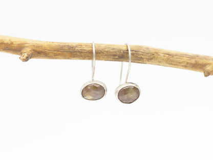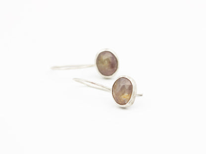 Need a little color and sparkle in your day? These beautiful, rose-cut pink sapphires are the solution! They're bezel set in fine silver and sterling and hang from soldered-on sterling ear wires. They're perfect for everyday wear and offer a fun and unique boho-chic vibe.