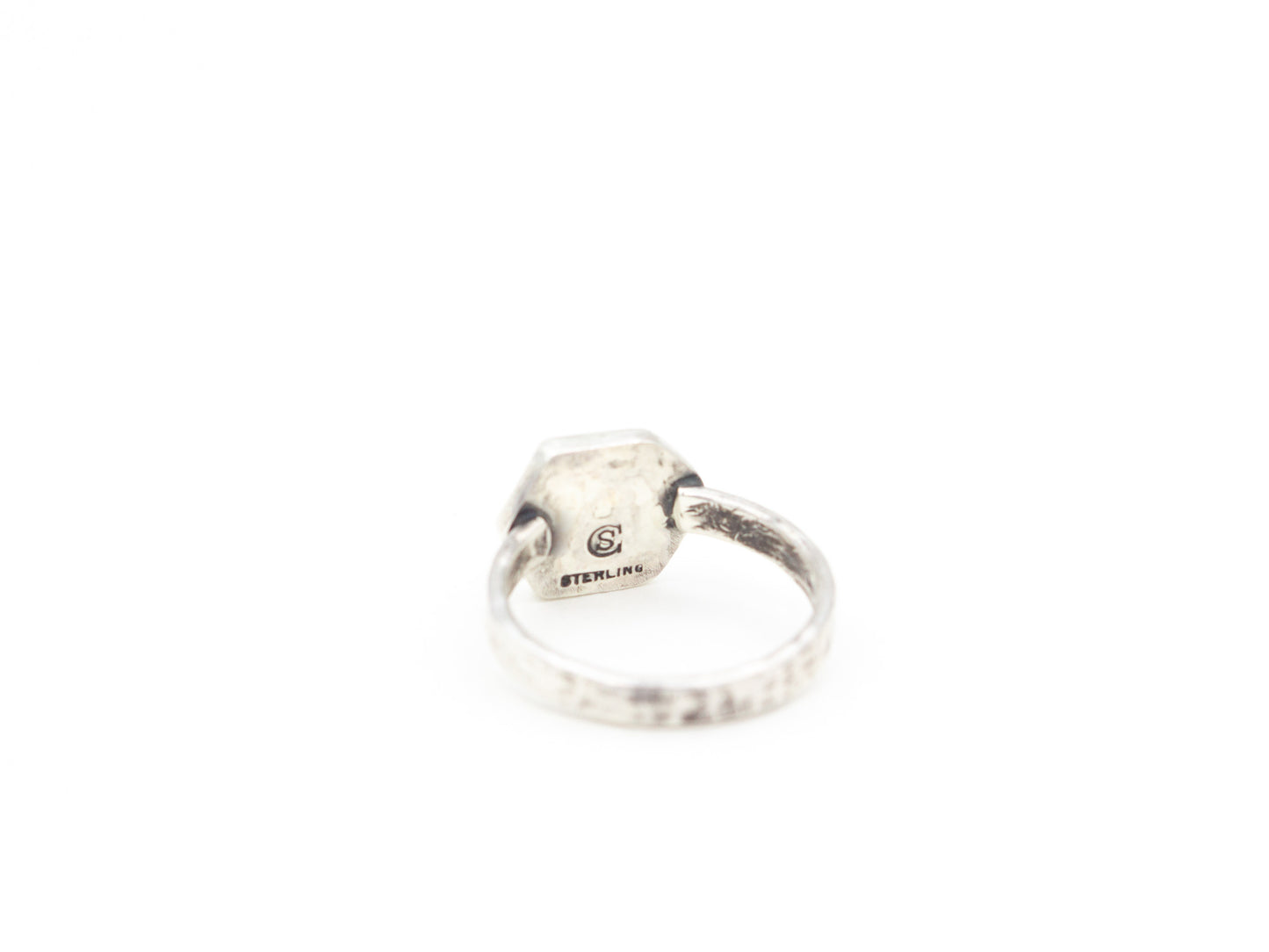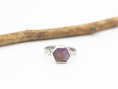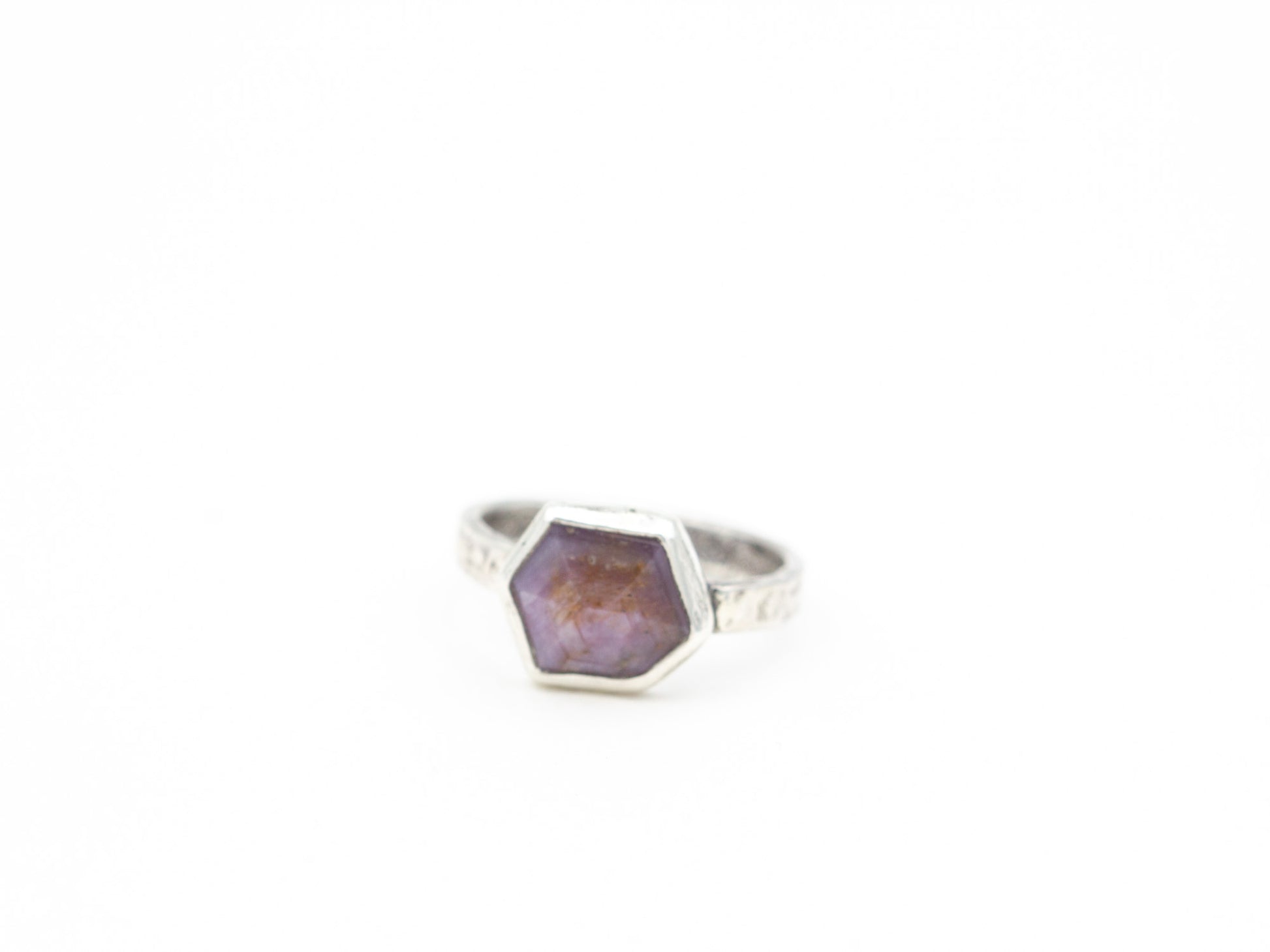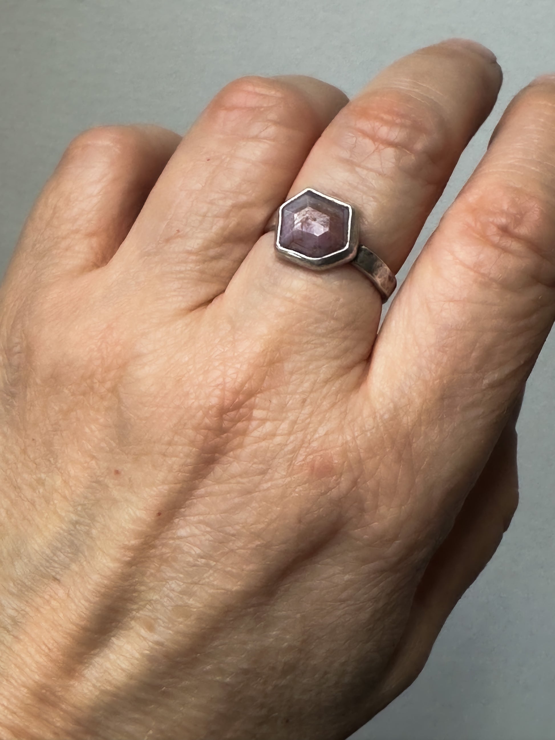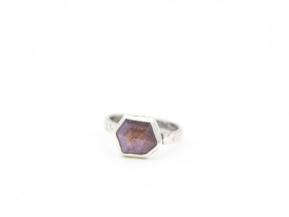 This is a super-pretty, natural, pink sapphire with a hint of peachy orange in a rose-cut, hexagon shape. I handmade a unique fine silver and sterling ring with it. It has a very comfortable hammer-textured sterling shank. Try it on, and you'll want to keep it on! Is this what you've been looking for to complement your unique style? If so, treat yourself!