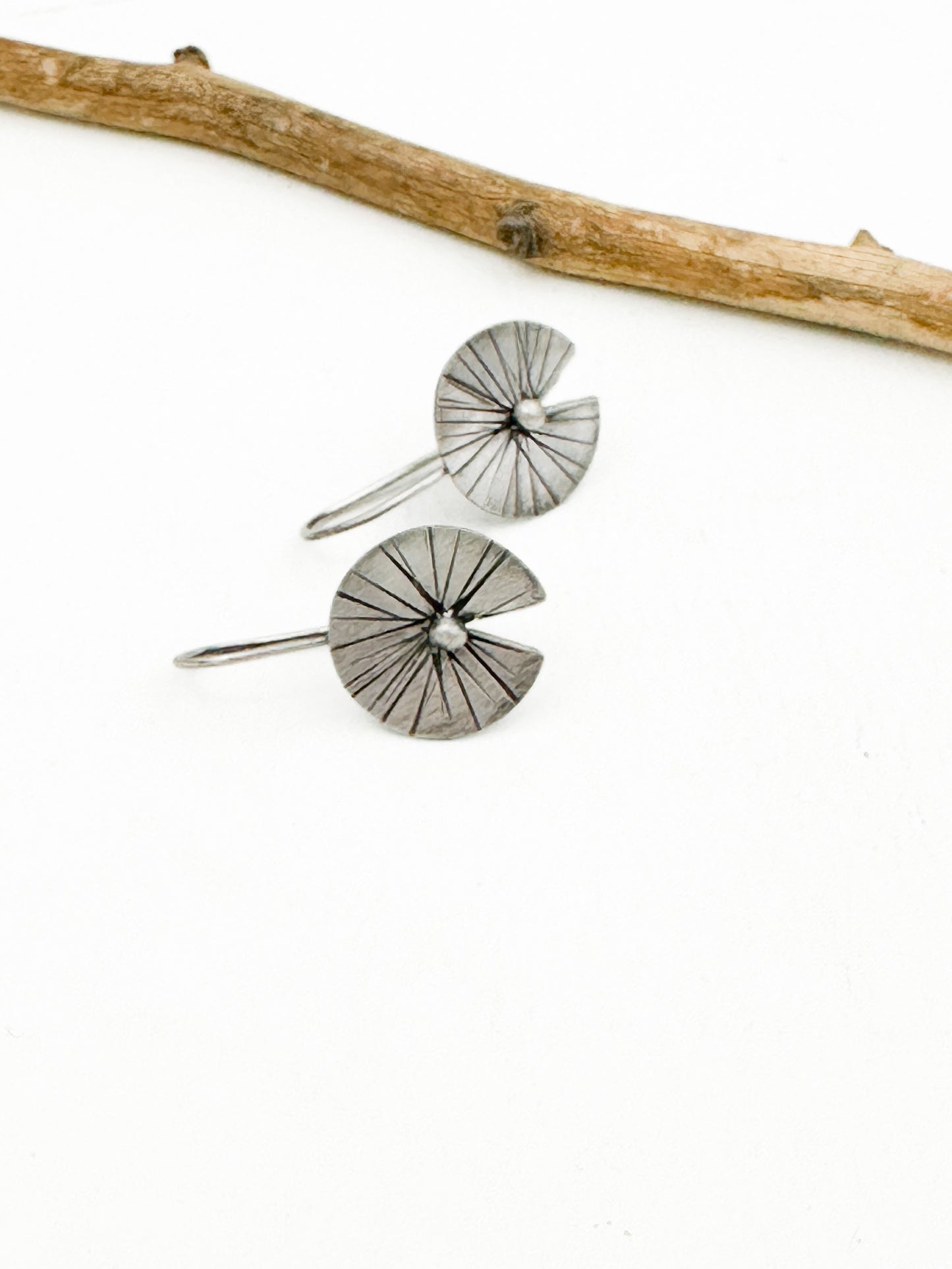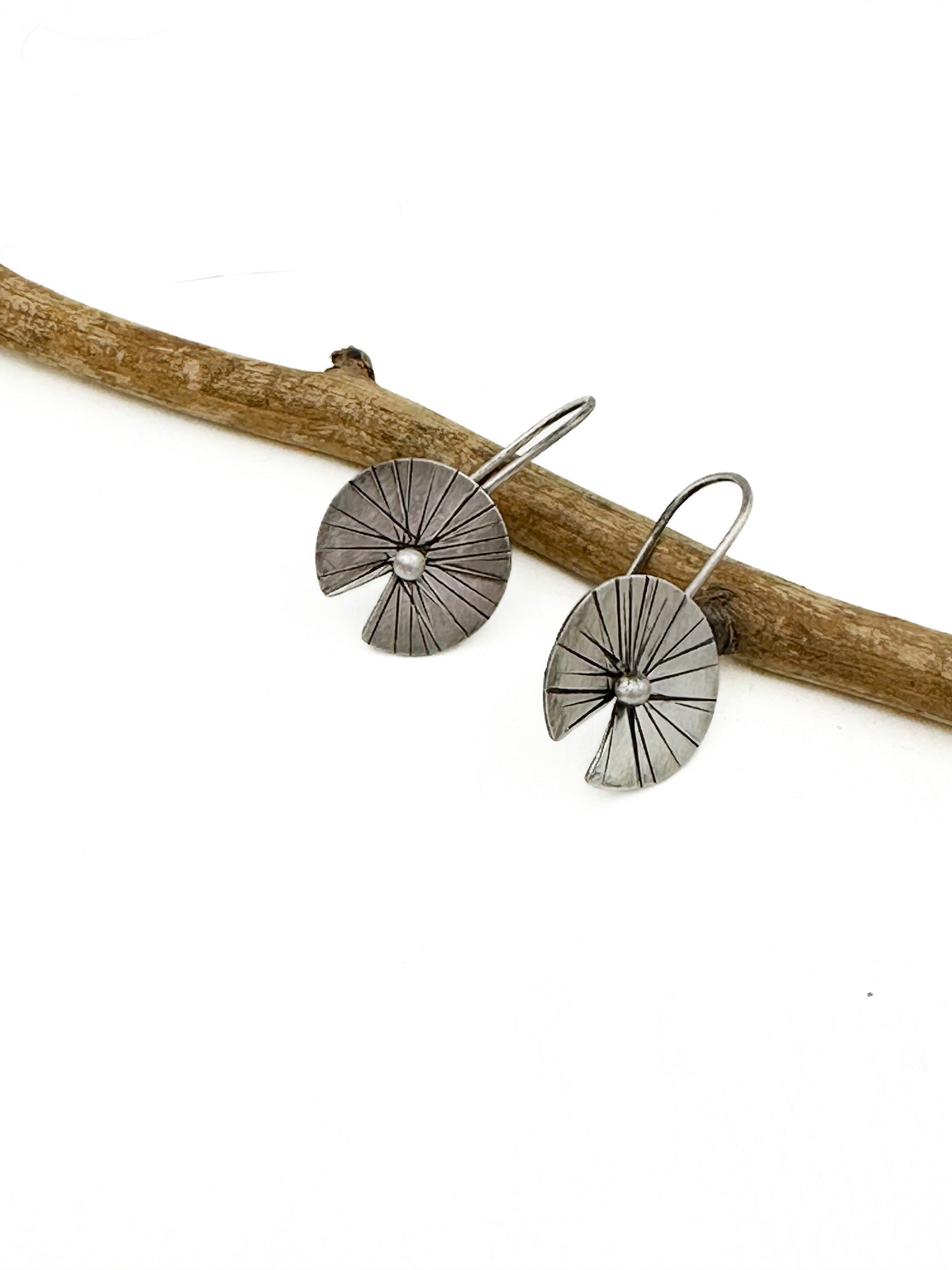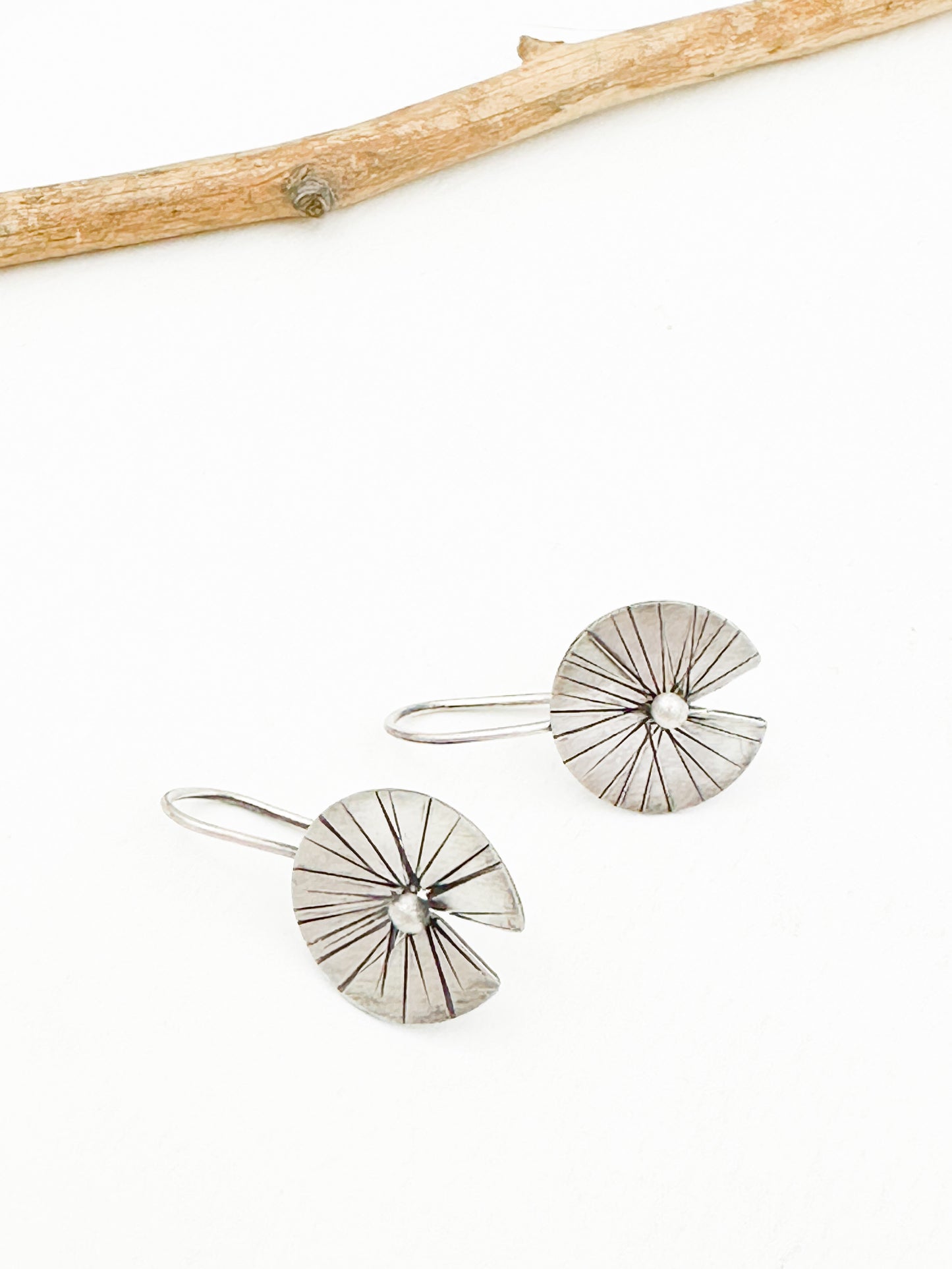 This is a pair of sterling silver circle earrings with hammered lines around them and a wedge cut out of the circles at the bottom. I added an accent ball of sterling to the middles. They have sterling silver ear wires soldered to them. Unique, lightweight and so pretty to wear! Perfect for you one-of-a-kind beautiful women!