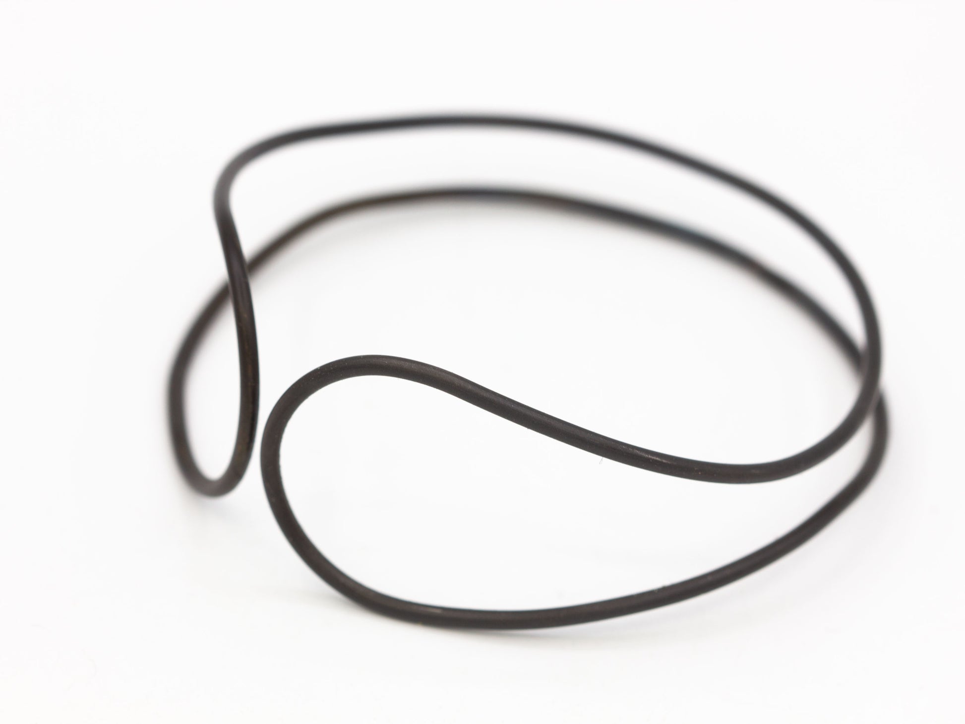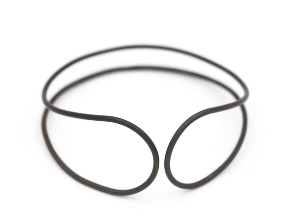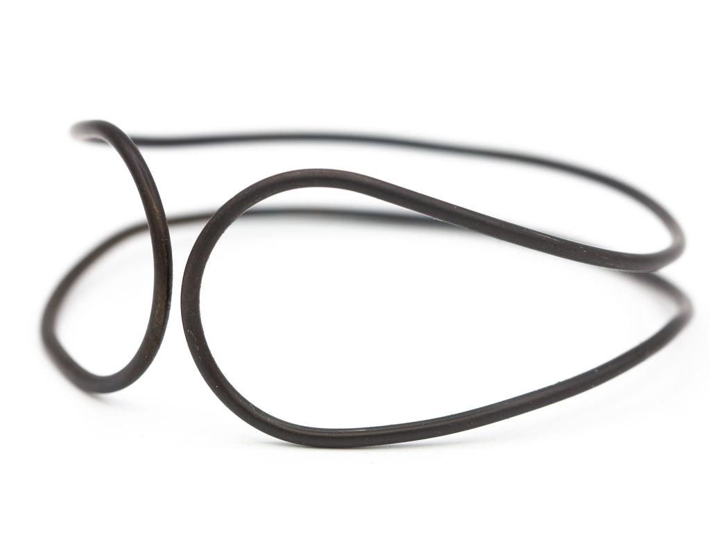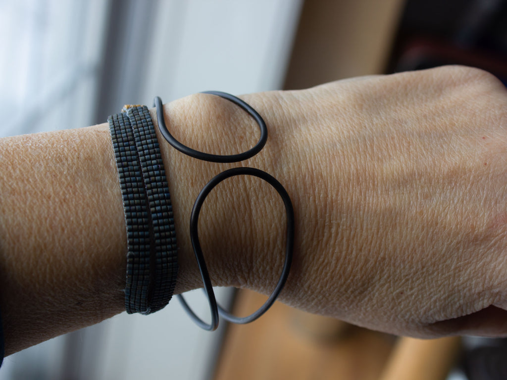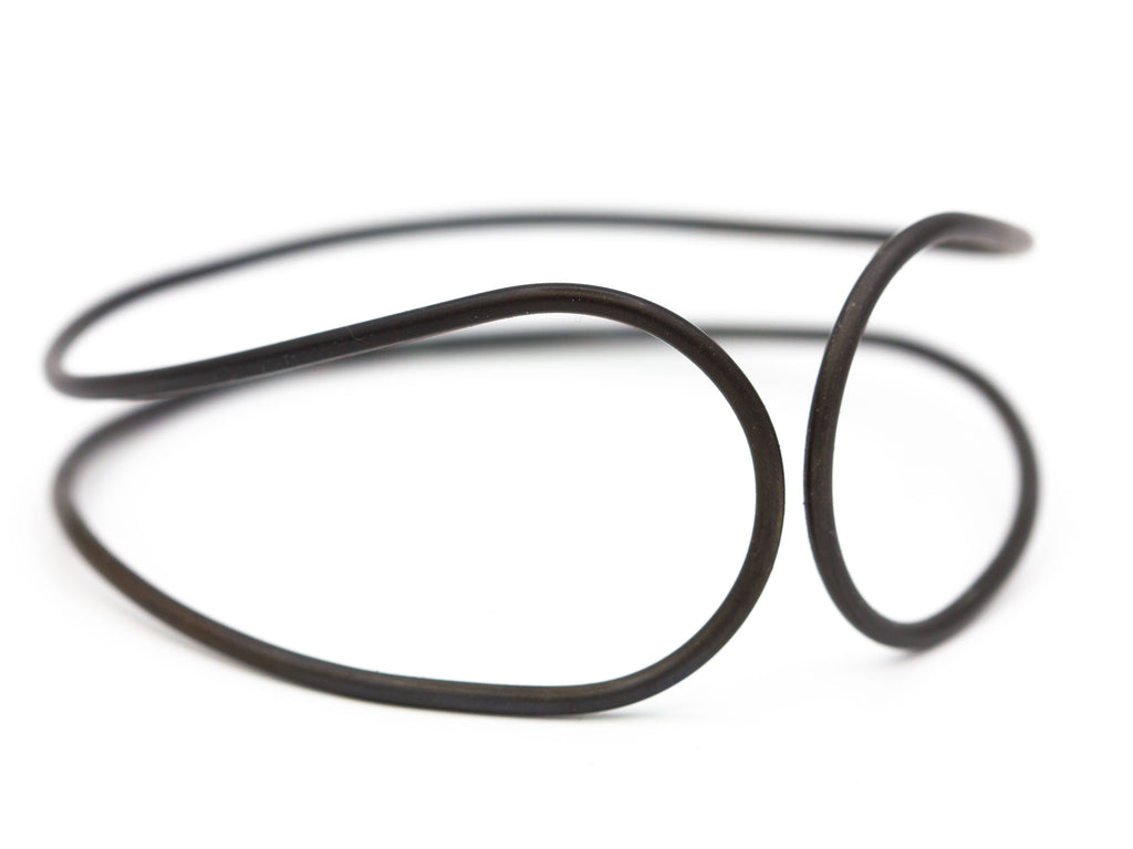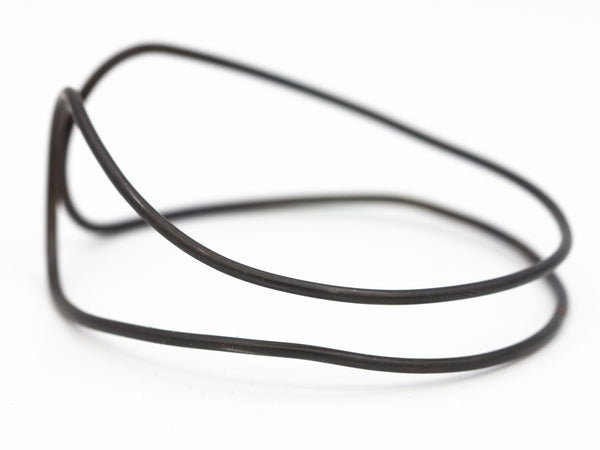 This is a black steel bangle with a real organic flow to it. I formed it with my hands and soldered it closed in one place, in the back. I blackened the steel then protected it with wax. It's solid, yet lightweight, making it comfortable and a pleasure to wear.