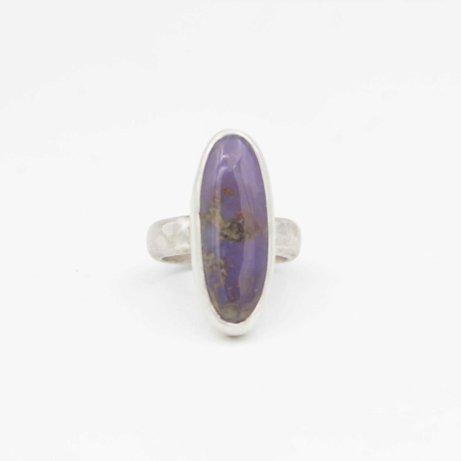 This is a high-grade Burro Creek agate that I made into a bezel-set ring that focuses all attention on this gorgeous stone. It has a hefty, hammer-textured band and a soft satin finish on the silver. You'll love wearing this one-of-a-kind, handmade statement piece, which may just become the ring you wear every day!