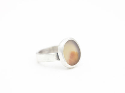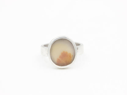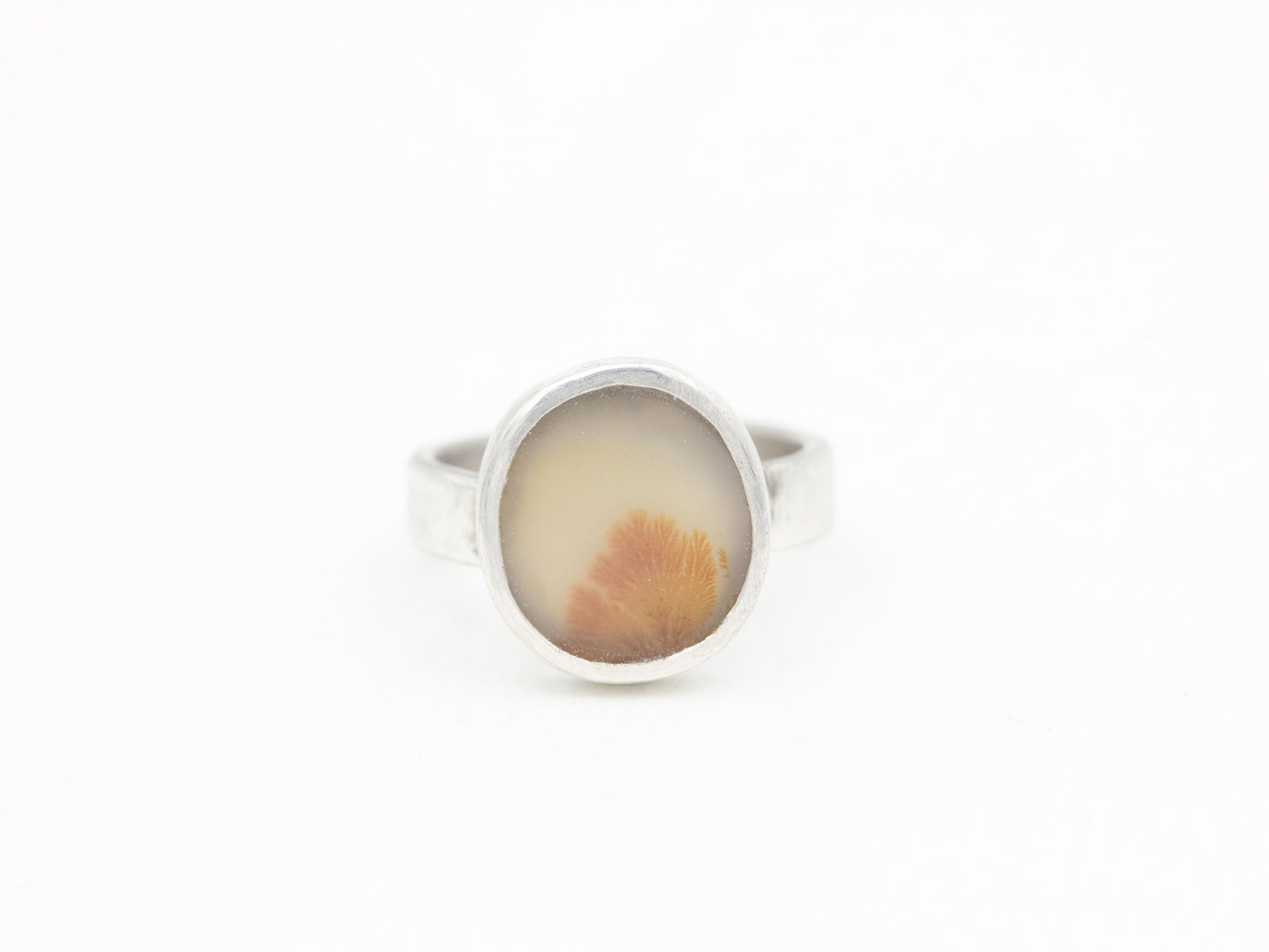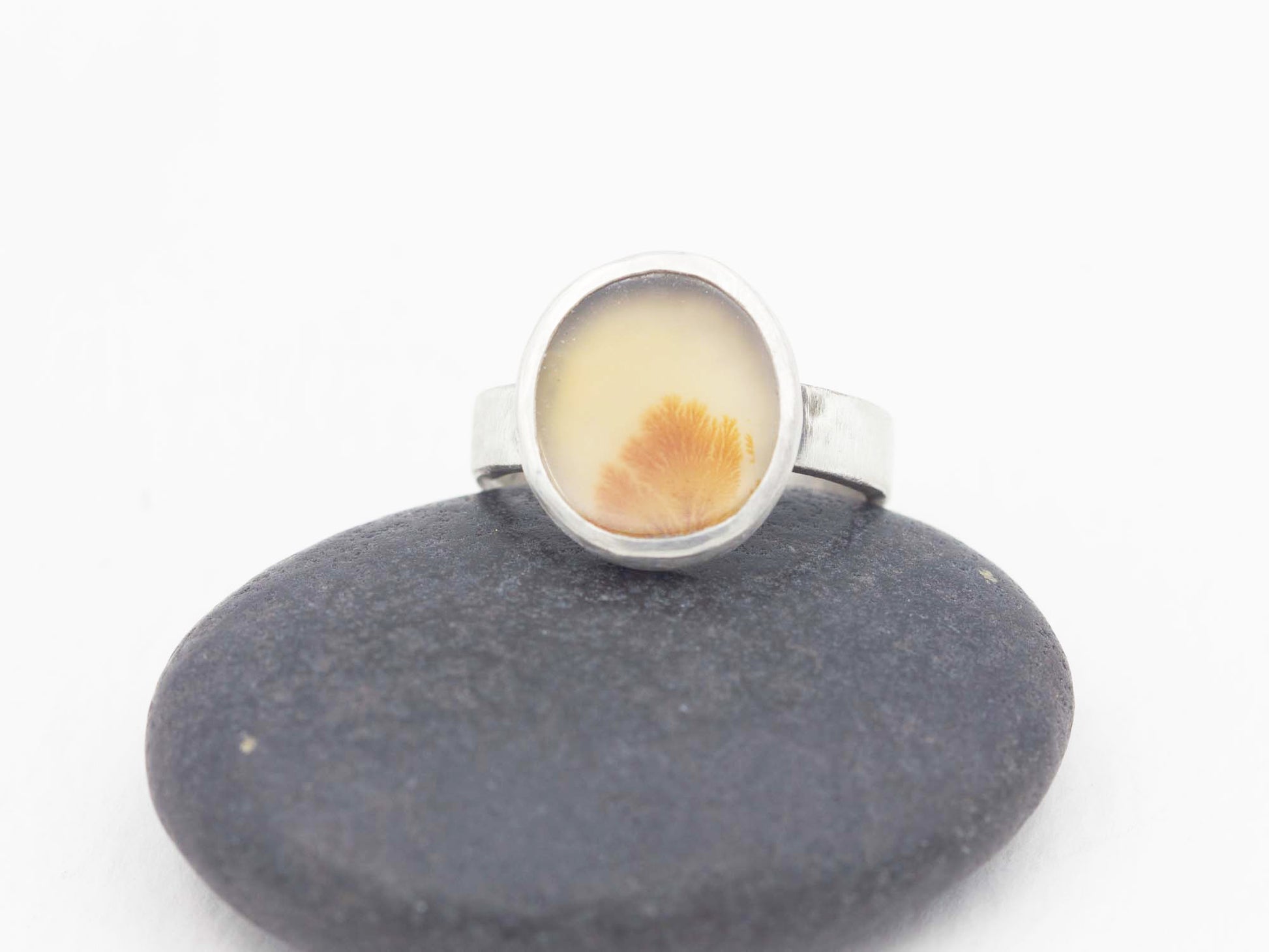 A beautiful oval dendritic agate with lovely orange dendrites on a milky agate background. The stone has a flat surface. It's a great ring to wear every day and forever. It's the ring for you if you're looking for a one-of-a-kind piece. It would also make a very unique gift!