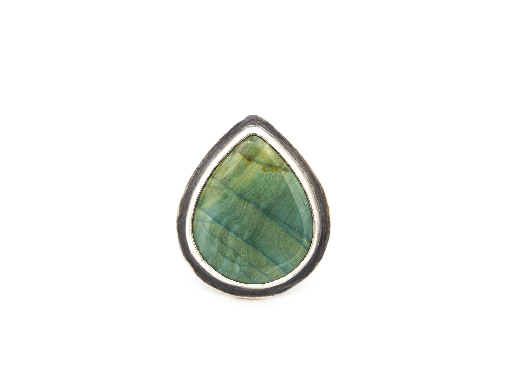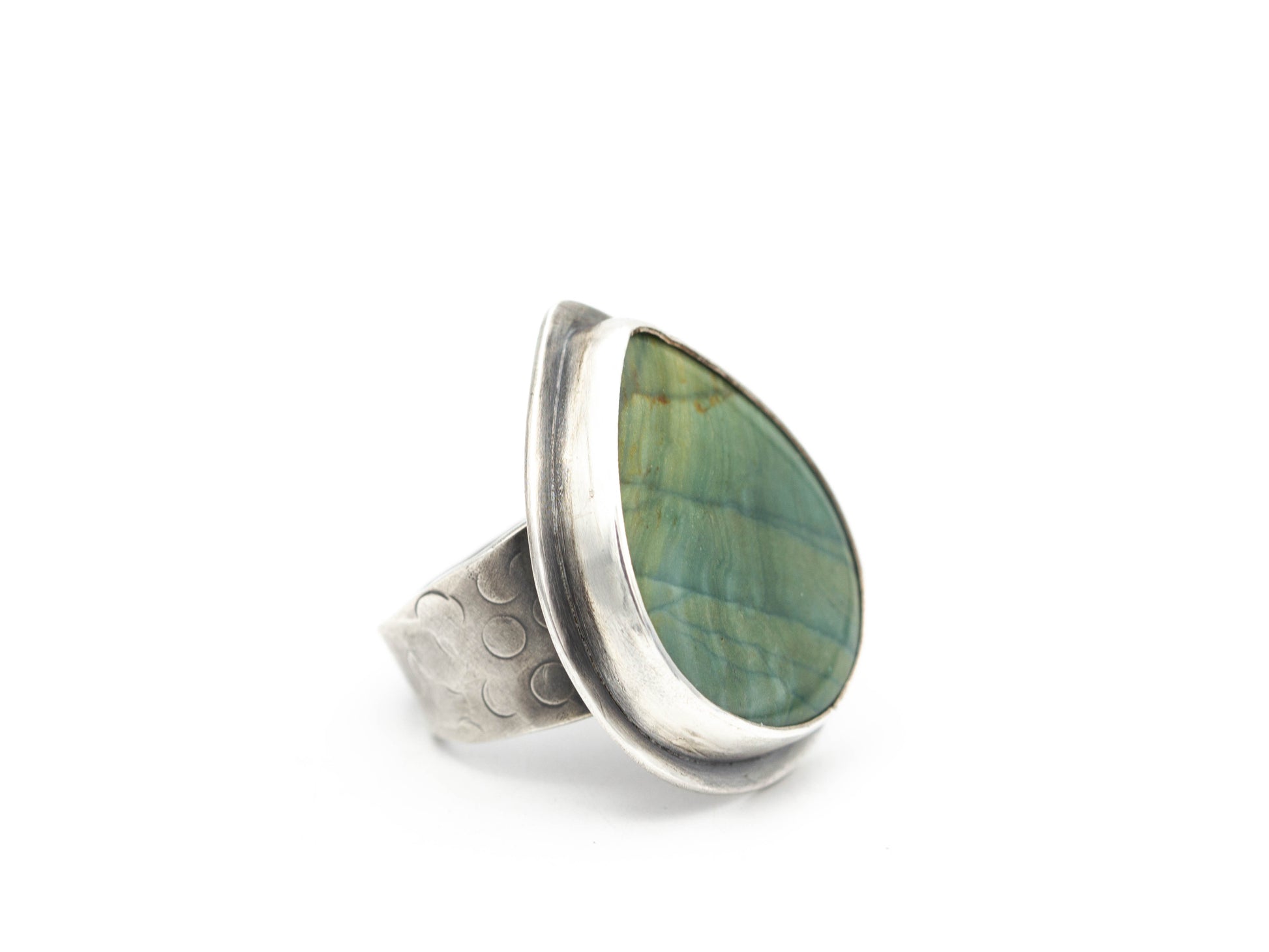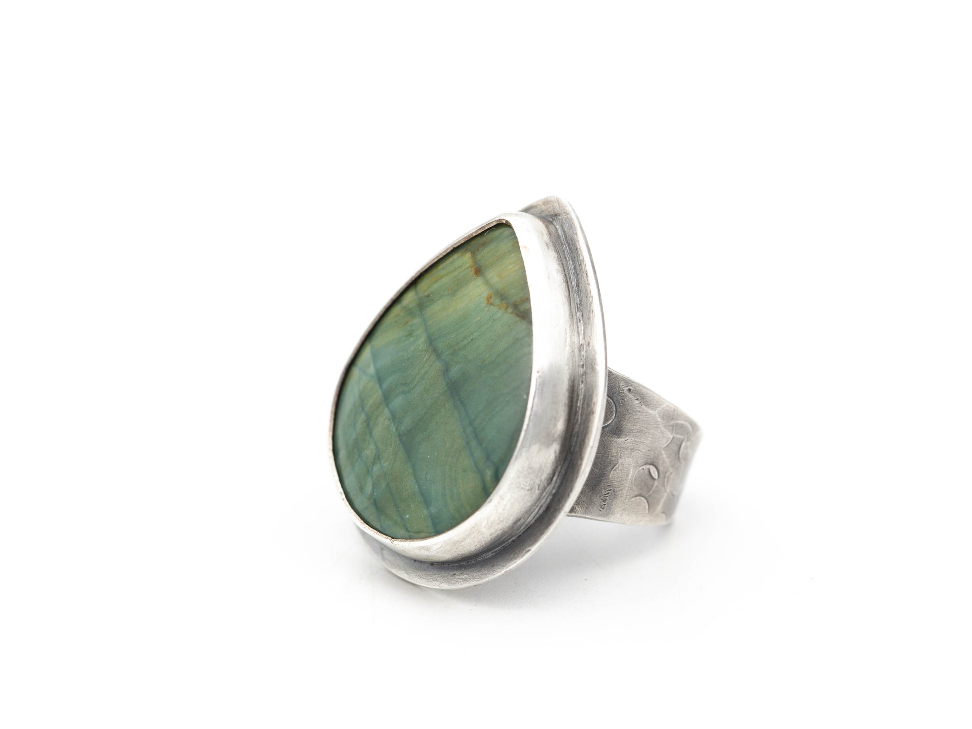 What a beauty of a stone! It's an Ellipso Jasper, a high-quality variation of the highly regarded Gary Green Jasper from near McDermitt, NV. It has a sterling and fine silver bezel setting on a tapered sterling band that's adjustable. The band has a subtle hammered circle pattern on it. It's a perfectly unique statement piece to wear at all times, or when the mood strikes!