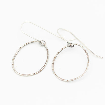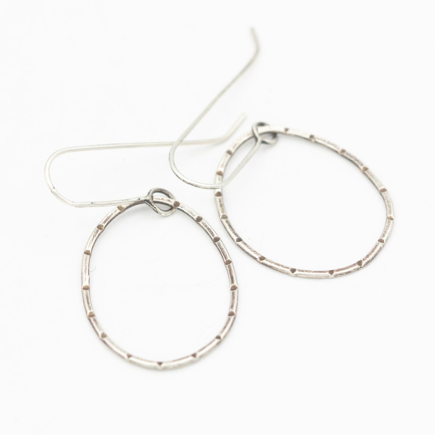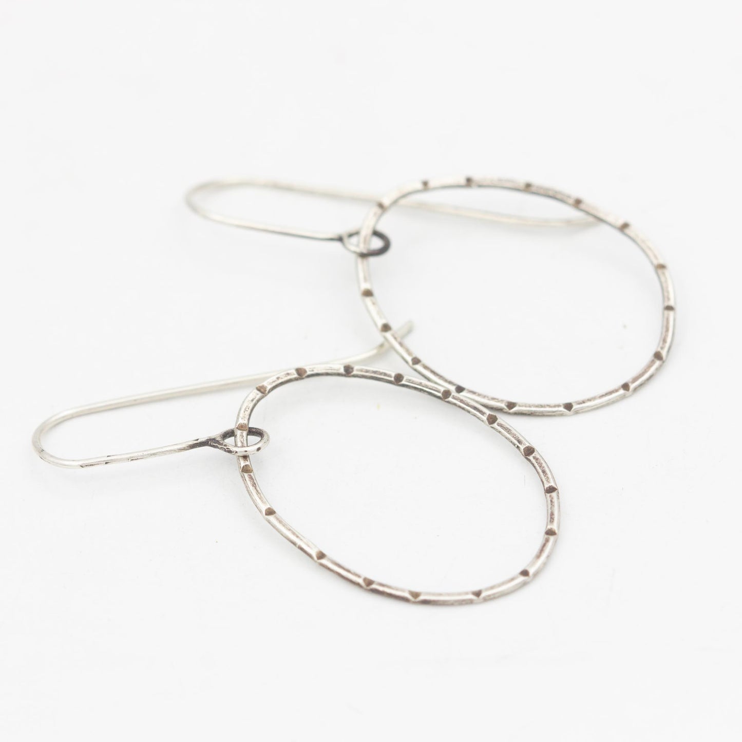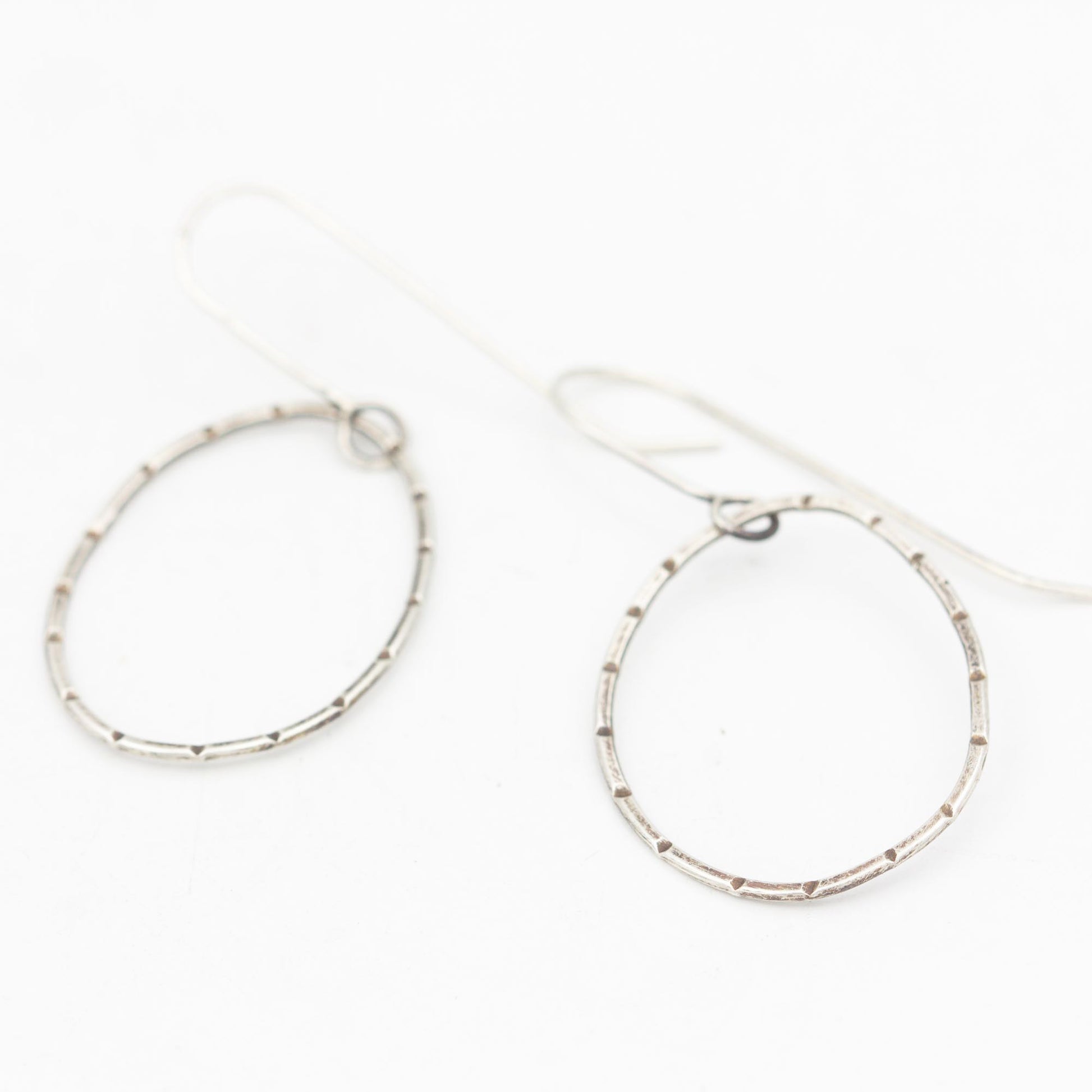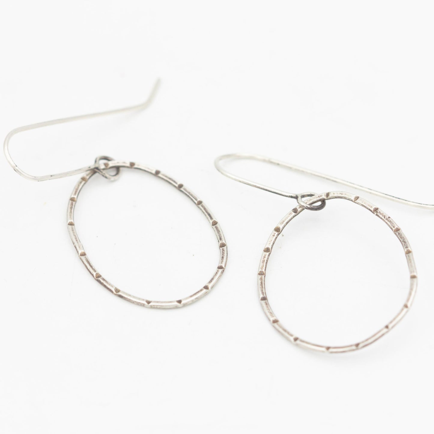 Looking for something fresh and fun for spring? Add these wonderful kinetic sterling hoops. You'll love wearing them to add a spring boost to your unique style! Two sterling ovals have a subtle line texture stamped into them and are free to rotate and float around on the handmade sterling ear wires. Lots of fun and you'll definitely be noticed!