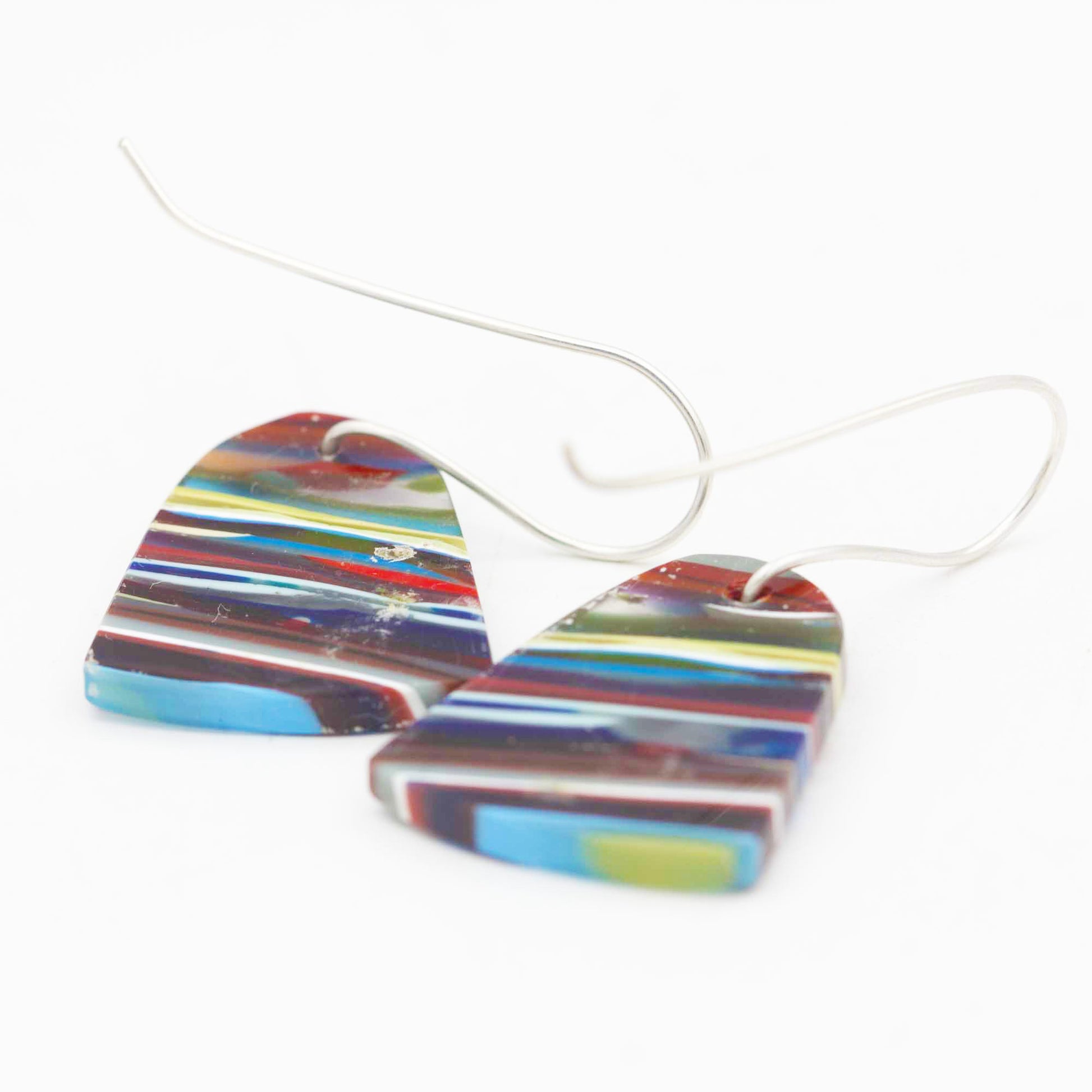 These colorful Surfite earrings feature tongue-shaped surfite that hang from handmade sterling silver ear wires. Surfite is a sustainable upcycled material created from hardened resin runoff collected from the surfboard manufacturing process.