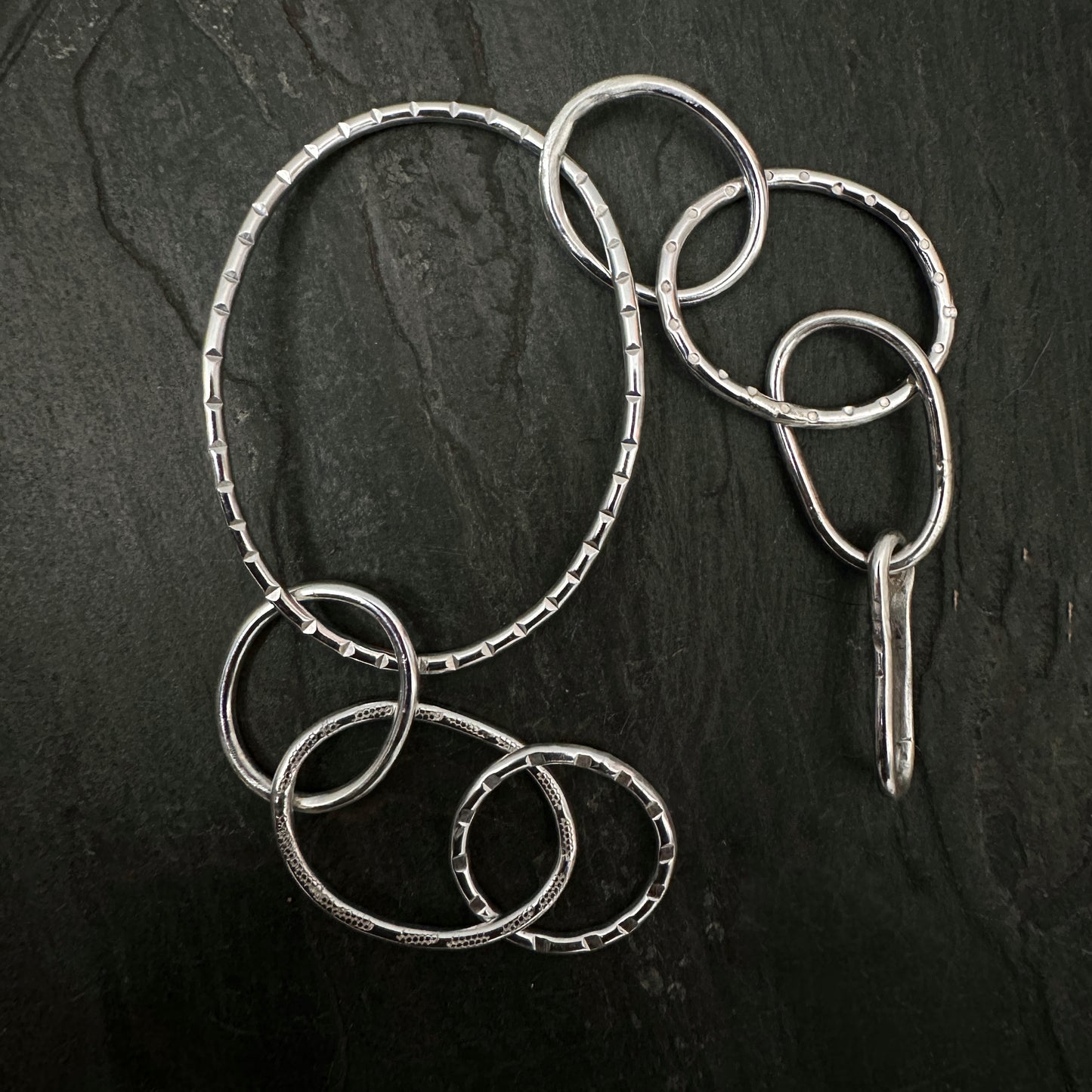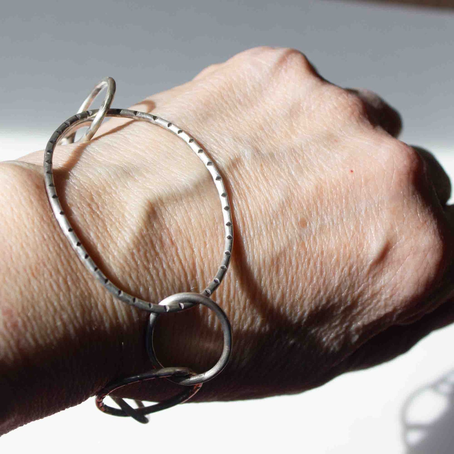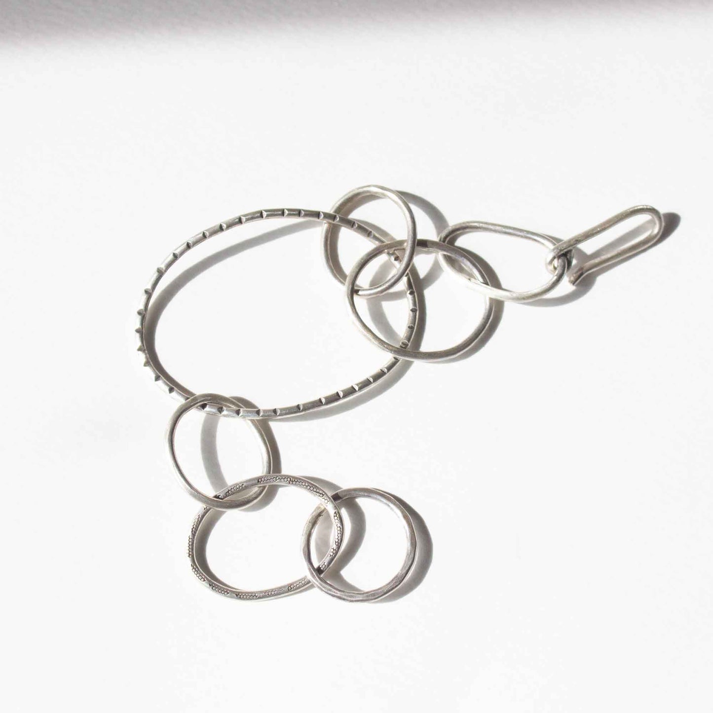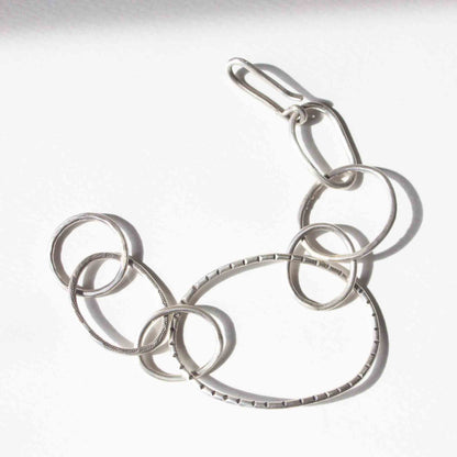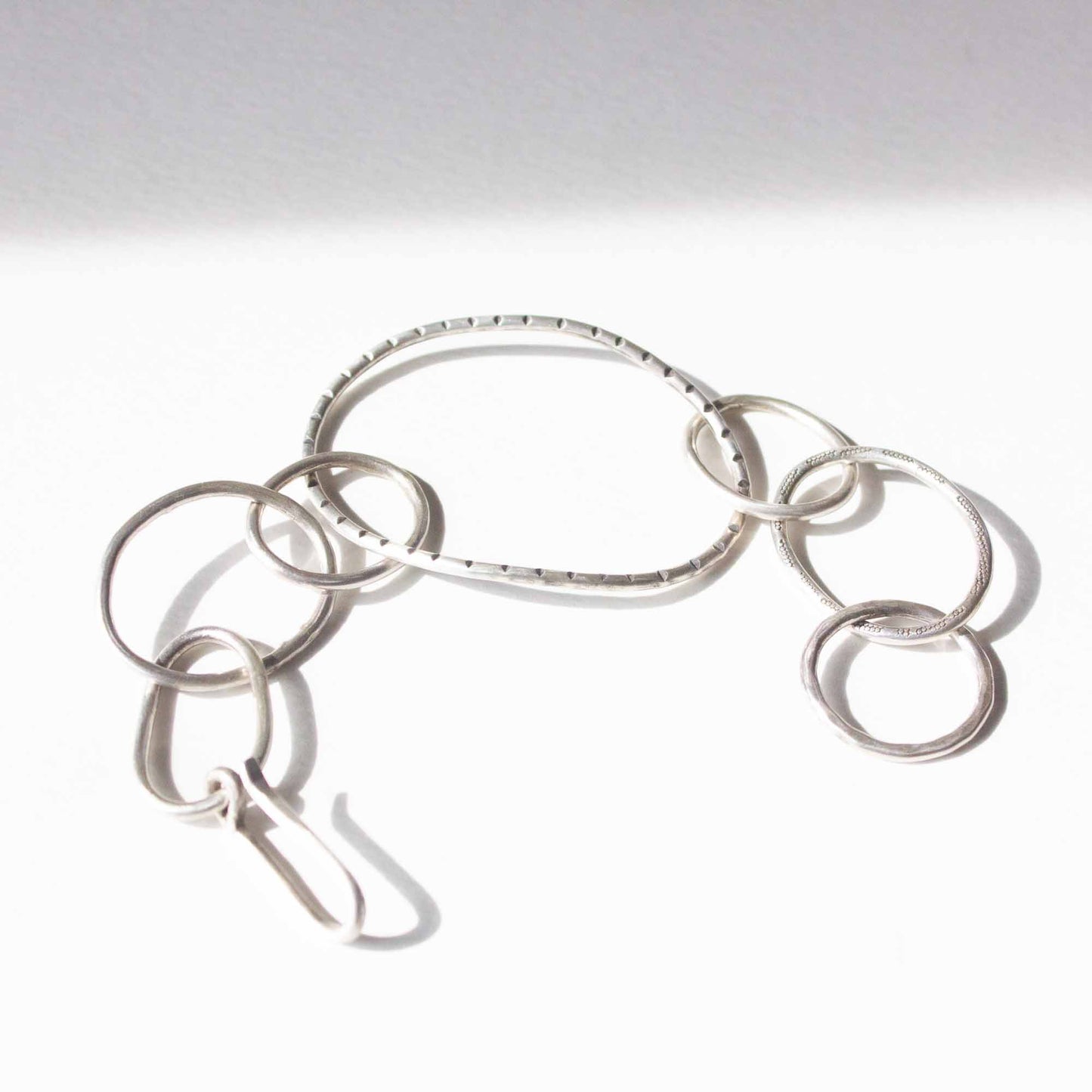 This handmade bracelet includes organically formed, sterling silver links with an oversize stamped one that sits on top of your wrist. It's a perfect boost for your unique style! Four of the links have stamped patterns. It closes with a solid, handmade sterling hook. Wear it alone or layer it with other bracelets to create something all your own!