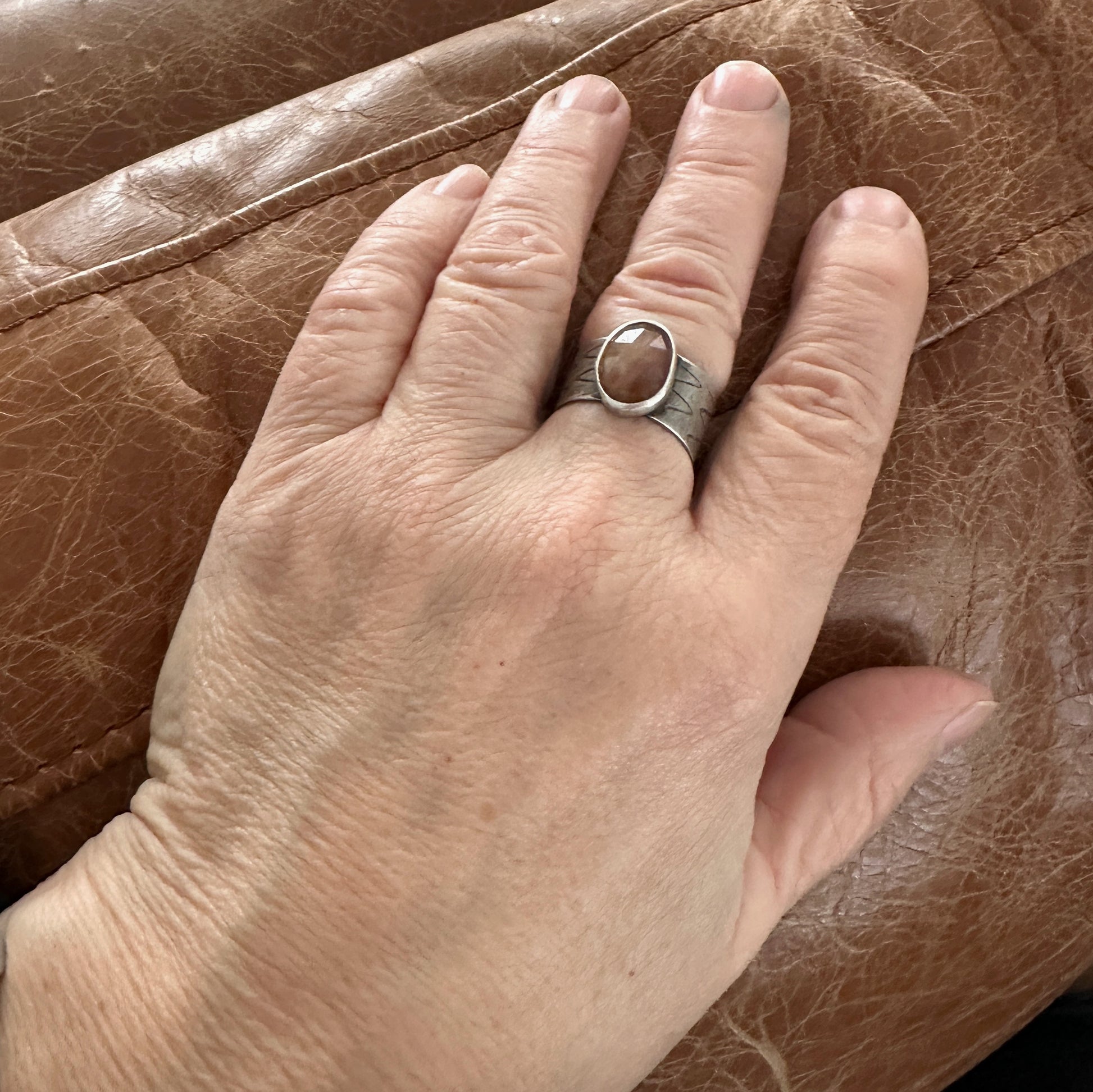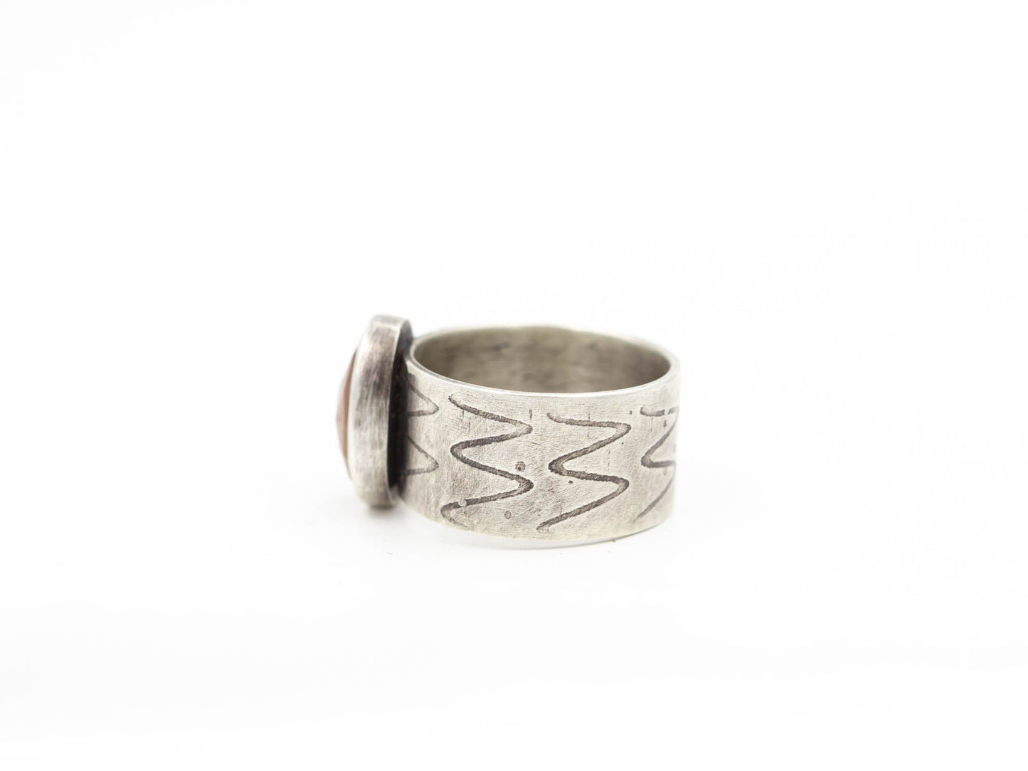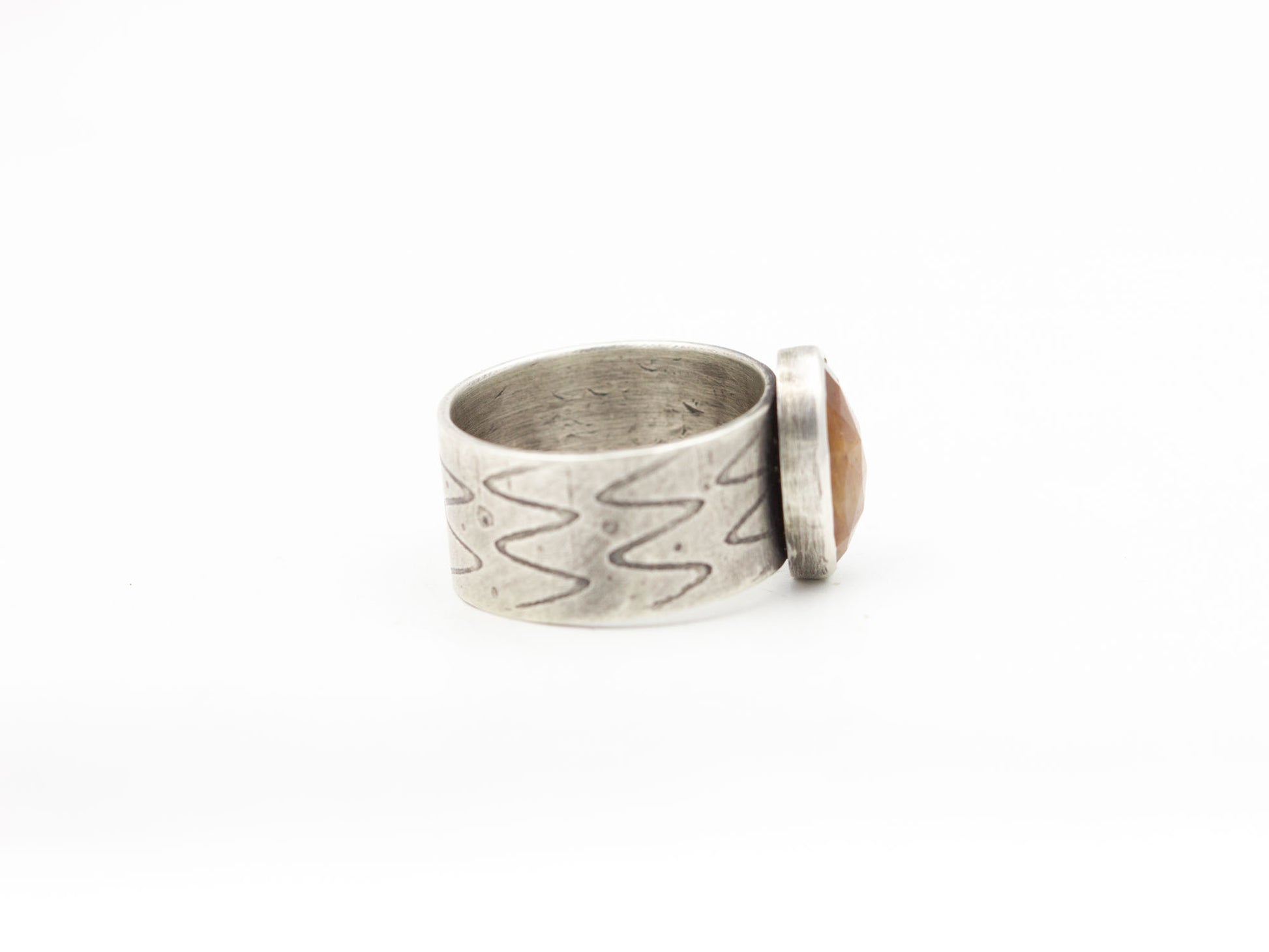 This is such a pretty pinky-orange rose-cut sapphire that's featured in a unique boho-chic ring. This statement ring is perfect for everyday wear. Once you see the sparkling rich colors in this stone, you won't want to take it off! The stone is bezel set in fine silver and sterling, and sits on a wide shank with an imprinted zigzag pattern. This would be a perfect ring for everyday wear and would also make a unique handmade gift.