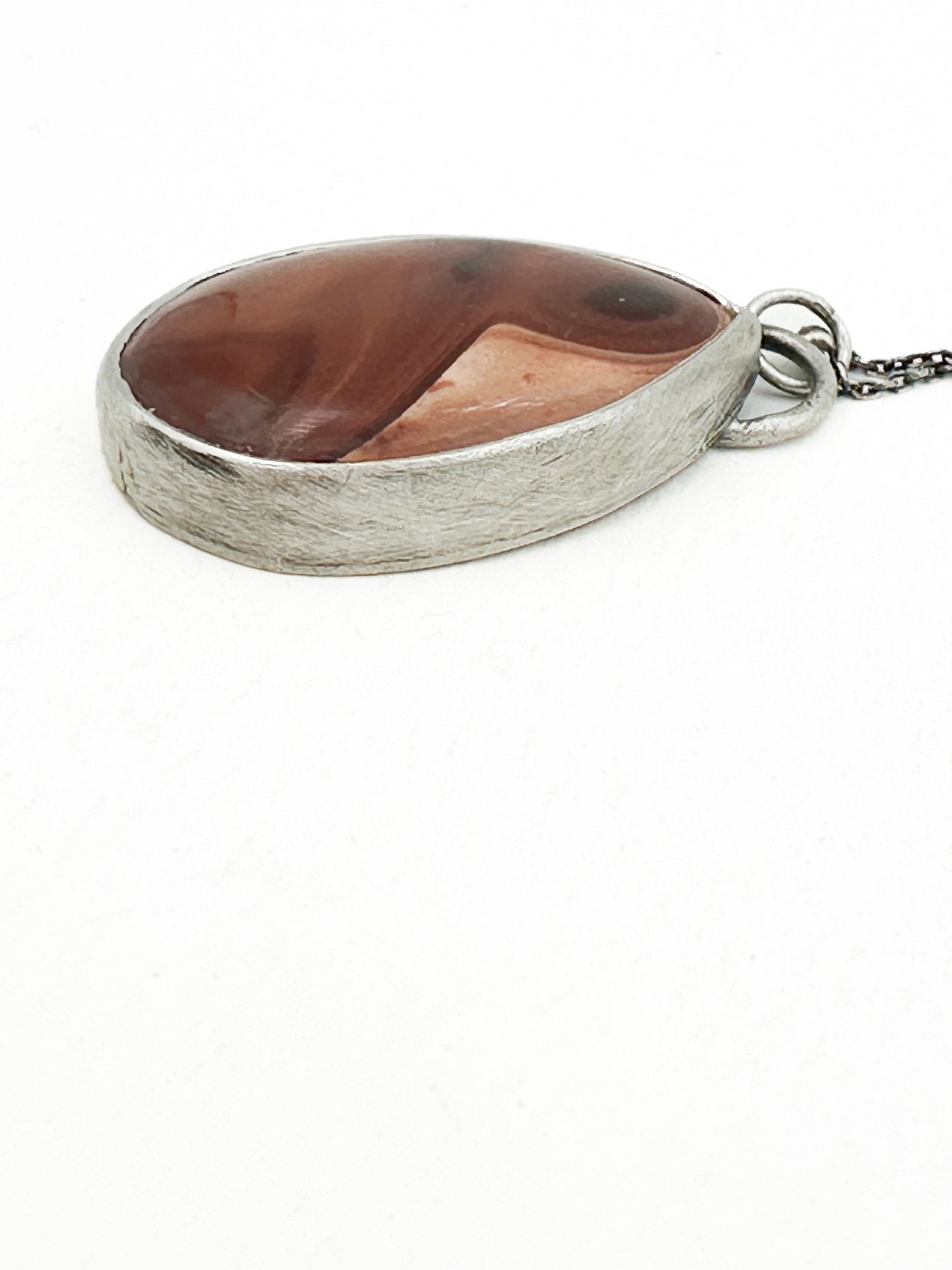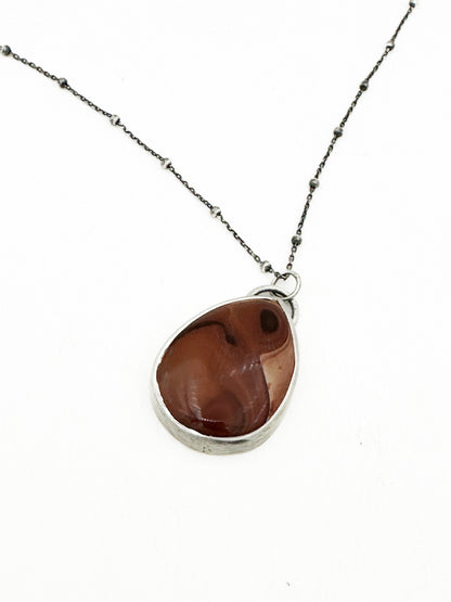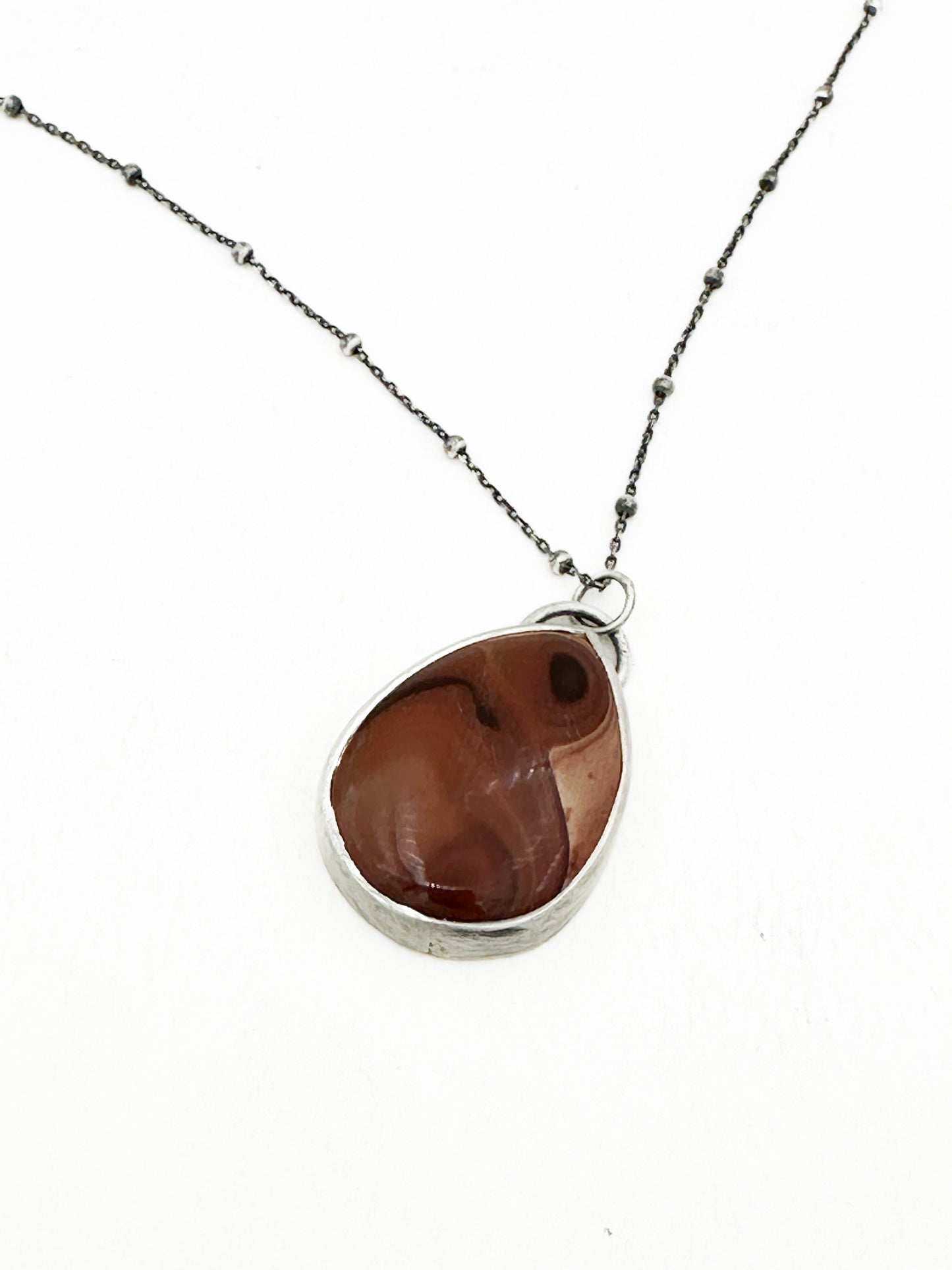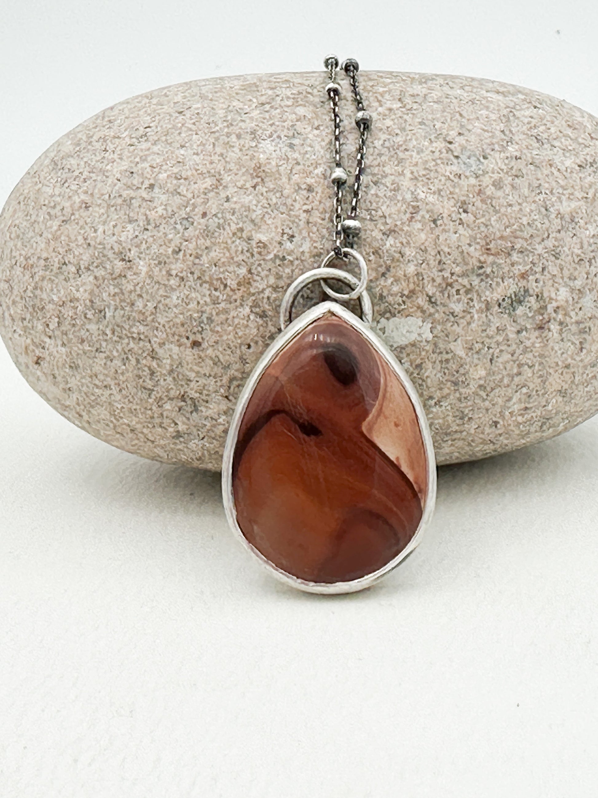 Are you a fan of warm, earth tones? If so, you'll want to think about grabbing this sterling silver statement pendant necklace featuring a teardrop-shaped polychrome jasper. It hangs from a sterling satellite chain. The colorful stone adds a touch of natural beauty to any outfit, making it the perfect adornment for any occasion. Upgrade your jewelry game with this unique and eye-catching piece.