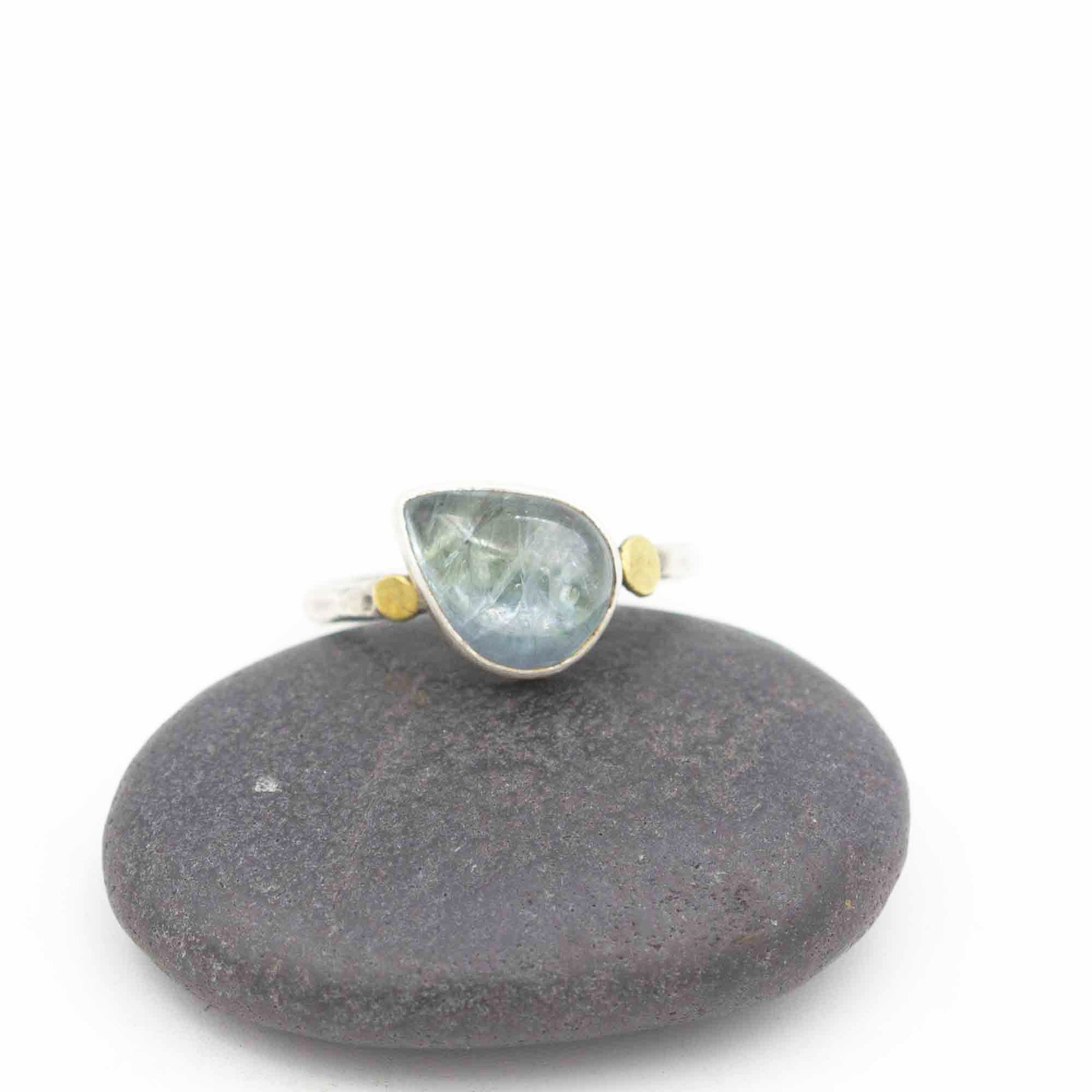 A translucent blue teardrop Tanzanite is bezel set in fine silver and sterling on a sterling silver shank. I added two asymmetrical 14k gold discs on either side of the setting for little luxe accents. The set stone sits on the shank at a tilted angle for extra interest. It's as unique as you! Make it your special signature piece.