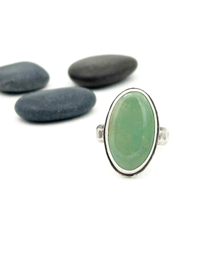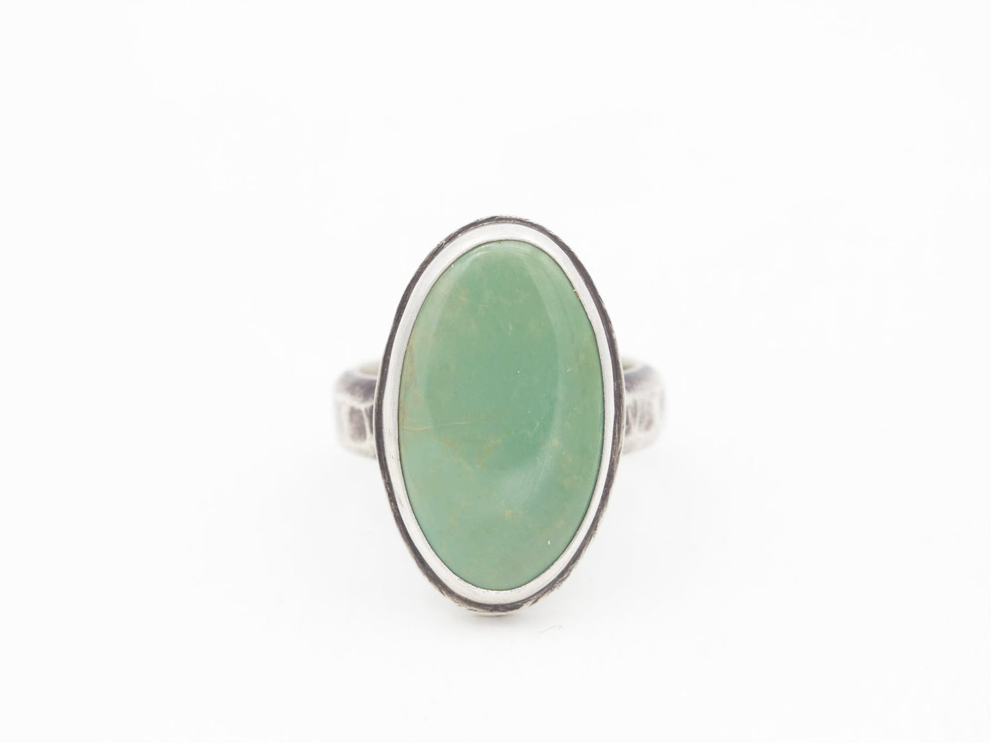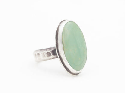 This oval turquoise statement ring has a fine silver and sterling silver bezel setting with a very slight border, along with a hammer textured sterling shank. It's got a great boho feel. Wear this handmade beauty every day to feel confident and uniquely you!