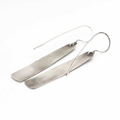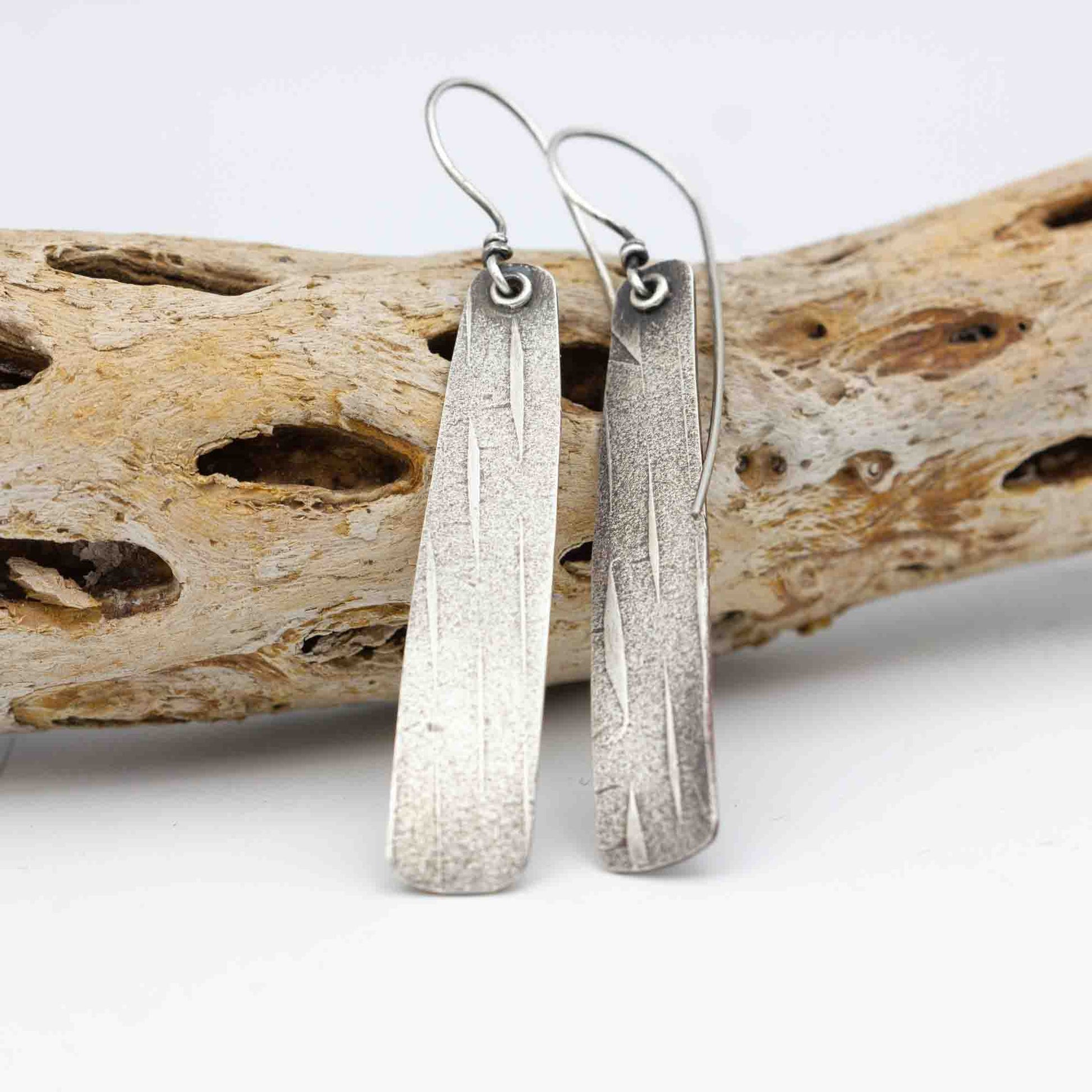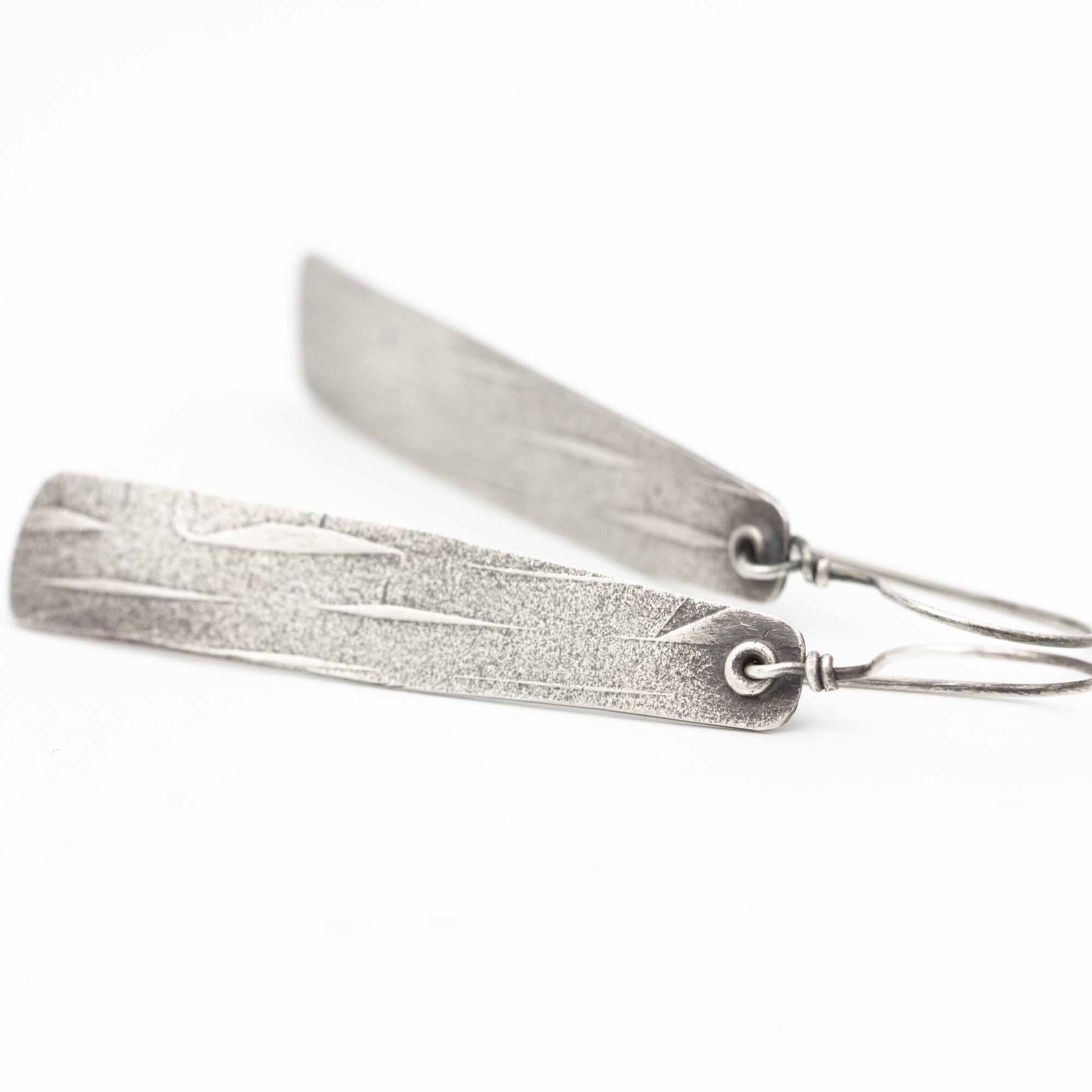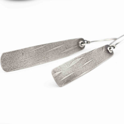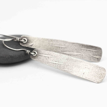 This is a pair of sterling silver drop earrings with plenty of texture and swing. They're imprinted with a geometric pattern of random elongated diamond shapes, surrounded by a sandy texture. Wearing unique earrings like these is the best! Confidence-inspiring and sure to make your day! They hang from hand formed sterling ear wires.